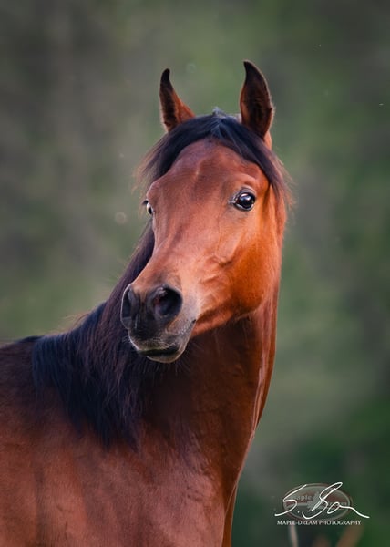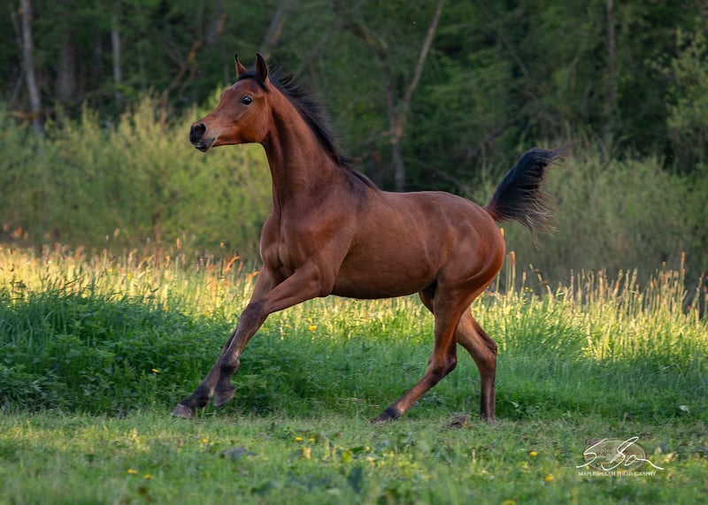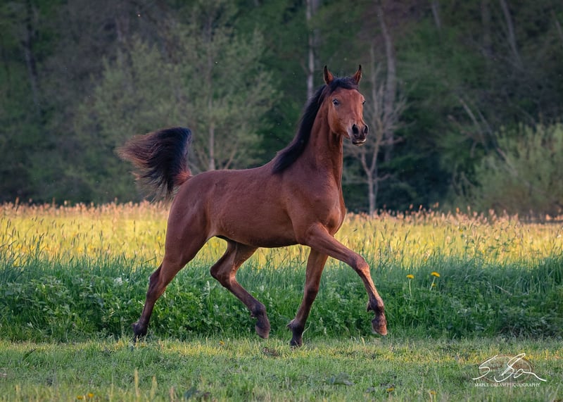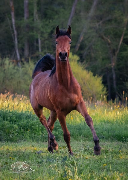 Marwan is a pure Egyptian, well-built, typy young stallion with excellent movement and a lovable character. He has a correct conformation with strong, well-angled foundations, a powerful body, and a good topline. His typy head flows into a slightly arched neck that is well-set on a long, sloped shoulder. He exhibits expressive, elastic movements and a friendly, people-oriented temperament. He has good nerves, is curious, and learns quickly. He enjoys working and engaging with people. All these qualities make him a promising partner for distance riding as well as for the ambitious leisure rider. His dam and sire are both good sport horses. Due to his pedigree, excellent conformation, and wonderful character, he is also suitable for breeding. He is free from the genetic defects SCID, CA, and LFS. Marwan is familiar with ground work, leading, hoof care, trailer loading, children, cattle, cats, dogs, chickens, large machinery, road traffic, etc.—in short, everything a young horse should know. He was raised in a herd and is well socialized. Upon request, Marwan can also be gelded and sold as a gelding. Further training in the stallion herd on-site is possible.