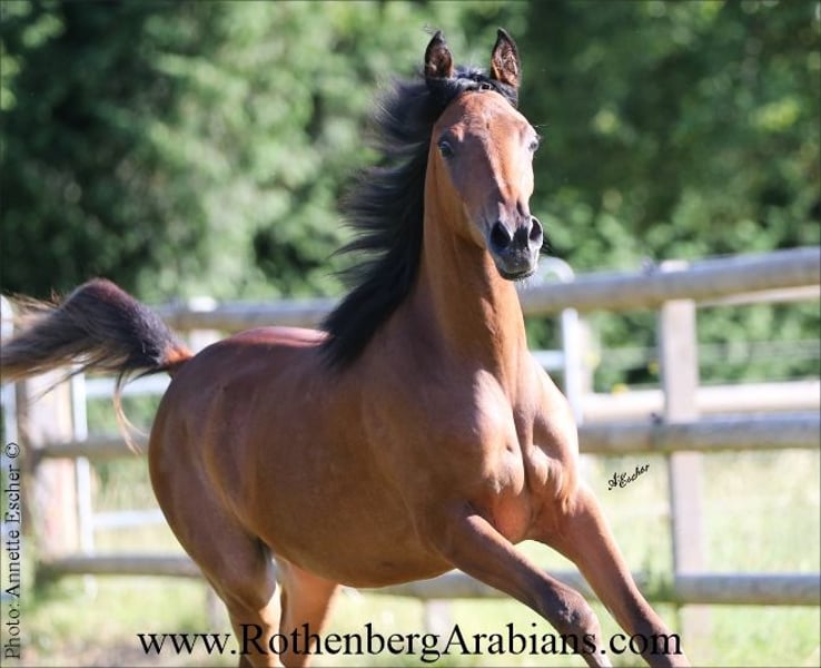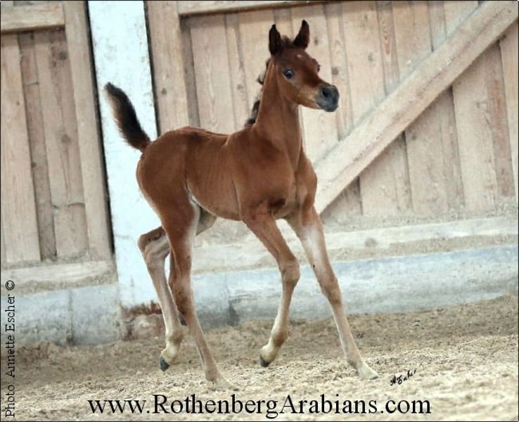 Exotic pretty bay Straight Egyptian yearling filly with black gene for sale! Father is our homebred black stallion GR Madhin (full-brother to our homebred black Champion-mares GR Marietta & GR Marianah; by our black Gold premium foundation stallion Madallan-Madheen), the mother is a daughter of our black Gold premium stallion Maheeb from the same motherline as our “Queen” GR Nashidah! Other exotic typey black, bay & grey Straight Egyptian foals, youngsters and breeding horses for breeding, show and sport for sale! Pearls from worldwide wellknown and successful breeding, famous and proven pedigrees and special people-loving characters! Detailed information, prices and conditions on request, please call at 0049 / 9091 / 3707 or send an e-mail including some information about you - thank you! More information to our breeding-horses and some sale-horses you find at our homepage www.RothenbergArabians.com, other sale-horses (also horses bred and owned by clients) on request! Please also visit us at instagram @RothenbergArabianStud