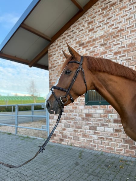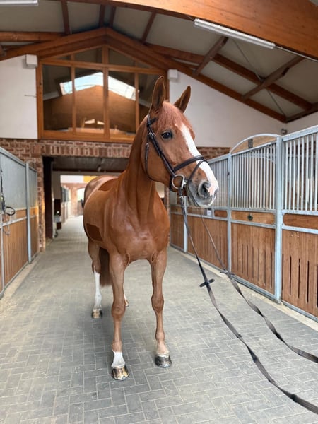 This beautiful chestnut mare, approximately 1.75 meters tall, impresses with her charm, expressiveness, and balanced temperament. She is very rideable and pleasant to ride in both show jumping and dressage. She particularly excels in the cross-country phase — demonstrating great scope, good technique, and the necessary caution. In handling, she is always well-behaved, uncomplicated, and friendly, making her an excellent choice for ambitious leisure riders or amateurs. Under saddle, she proves to be reliable and easy to manage — a mare that brings daily joy with her willingness to perform and her honest character. She also remains calm and fearless in the terrain and is absolutely straightforward and well-behaved when loading, trimming, or at the blacksmith.