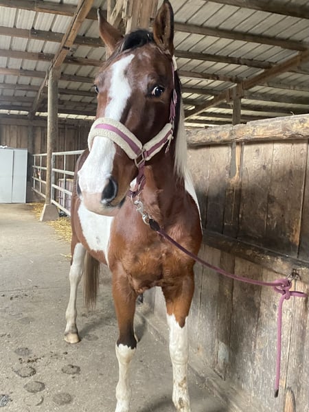 Verkaufe American Paint Horse Stute – Tobiano-Farben, Geburtsjahr 2019 Zum Verkauf steht eine wunderschöne American Paint Horse Stute, geboren im Jahr 2015. Sie besticht durch ihr einzigartiges Tobiano-Farbmuster in verschiedenen Farben, das sie zu einem echten Blickfang macht. Mit einem Stockmaß von 155 cm ist sie perfekt für Freizeitaktivitäten geeignet. Sie ist freundlich, artig und eignet sich ideal für den Freizeitbereich. Ob Ausritte, Spaziergänge ,Joggen gehen, Training in der Halle– diese Stute ist eine motivierte Begleiterin. Sie ist spritzig und trittsicher und geht mühelos über Stock und Stein. Braucht einen ruhigen Reiter mit feinen Hilfen und klarer Führung, daher nicht für Anfänger geeignet. Kein Beißen, buckeln, steigen. Gibt brav die Hufe und lässt sich problemlos verladen. Läuft mit und ohne Eisen. Bei Interesse oder weiteren Fragen stehe ich gerne zur Verfügung. Besichtigung und Probereiten nach Vereinbarung möglich.
