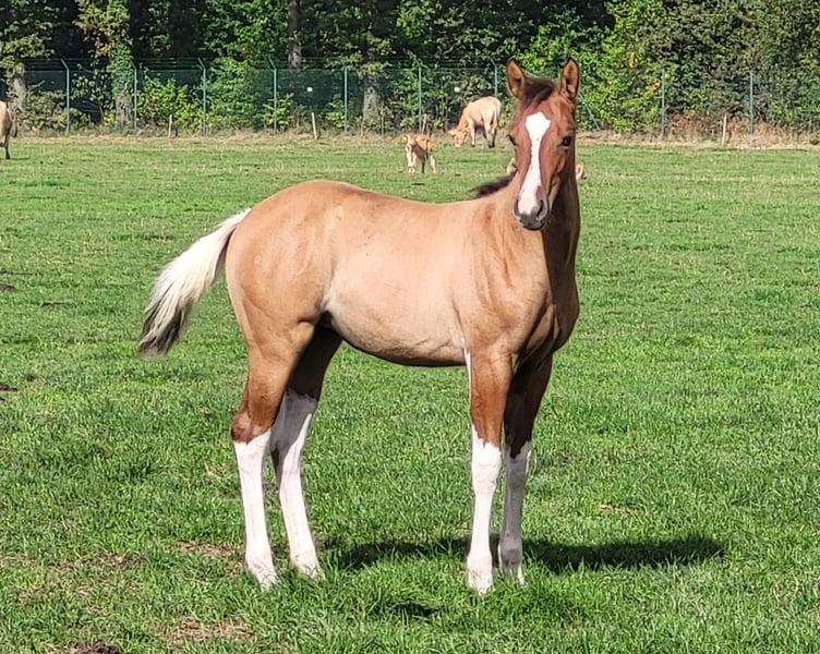 🌾 Lola – betoverend baydun merrieveulen met hart & talent! 🌾 Sommige veulens zijn vanaf het eerste moment gewoon bijzonder – en Lola is er zo één. Met haar prachtige dunkleur, correcte bouw en haar zachte, nieuwsgierige karakter weet ze iedereen voor zich te winnen. ✨ Bij het PHCG Bundesfohlenchampionat 2025 behaalde Lola een knappe 6e plaats – een mooie bevestiging van haar kwaliteit en potentie. Ze groeit bij ons op in een liefdevolle gezinssfeer en leert met plezier het veulen-ABC: kinderen, tractoren, trailer laden, de hoefsmid… niets brengt haar van haar stuk. Verwachte stokmaat: ca. 1,50 – 1,55 m Beschikbaar vanaf: november 2025 / na het spenen 📜 Afstamming: 🔹 Vader: Blackburn Buck Poco – Foundation Quarter Horse (96–100%), dubbel Poco Bueno, kleinzoon van Pretty Boy. Rustig, eerlijk en betrouwbaar. 🔹 Moeder: RK Sweet Lady Buttons – elegant en slim, behaalde zelf de 9e plaats op het PHCG Bundesstutenchampionat 2025. 💛 Lola combineert schoonheid, verstand en een gouden karakter – een veulen om verliefd op te worden!