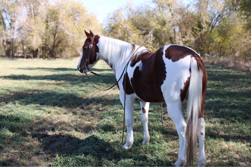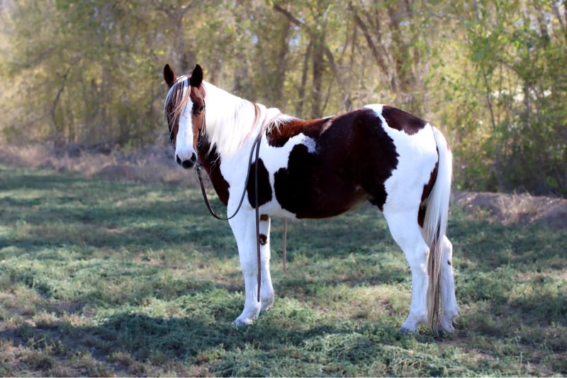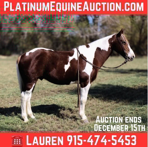 ONLINE AUCTION Place your bids at www.PlatinumEquineAuction.com Starting Bid $3500 Auction ends December 15th, 2024 Need a new saddle? Check out White Rock Saddles on our website or Facebook! Pinto beans is the absolute kid horse! He’s SAFE SAFE SAFE! Pinto beans has been the baby sitter around our place we bring him out for all the kids and beginners. From trail riding down the road or giving rides at the family parties he’s our go to. Pinto beans is 9 years old he stands 14h tall he’s built like a like bulldog quarter horse short,stocky, big hip with a little head. He’s got the coolest paint color with a long mane and tail that touches the ground and a kind dark eye. We’ve used him also on the ranch from rounding cows up or pushing steers up at the roping practices. Beans has also been rode in the arena he knows his leads, he will lope big pretty circles. He’s been around the barrels, flags, tarps, traffic, he’s absolutely safe for any level rider will be safe everyday of the week and 100% reliable. Beans is easy to shoe, saddle , bathe , load and haul with no issues. He will be straight legged no bumps or blemishes and 100% sound. If you are looking for your next family horse pinto beans is your guy don’t miss him. Contact Lauren Lara 915-474-5453 with any questions. Located in El Paso, TX. ONLINE AUCTION Place your bids at www.PlatinumEquineAuction.com Starting Bid $3500 Auction ends December 15th, 2024 Need a new saddle? Check out White Rock Saddles on our website or Facebook!