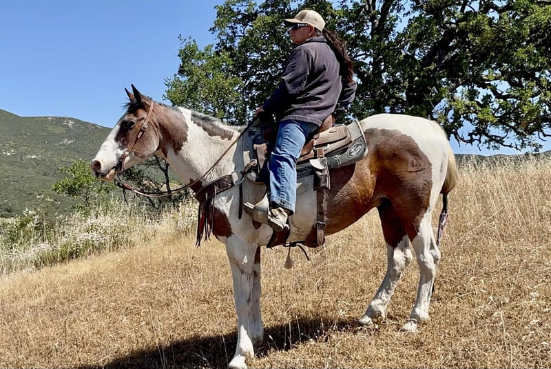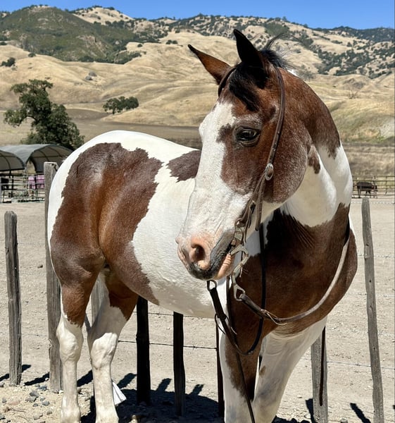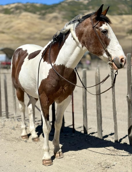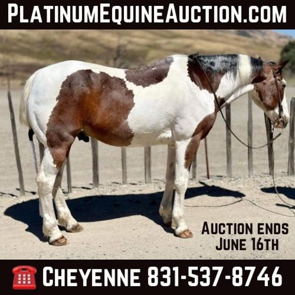 ONLINE AUCTION Place your bids at www.PlatinumEquineAuction.com Starting Bid $3500 Auction ends June 16th, 2024 Need a new saddle? Check out White Rock Saddles on our website or Facebook! Meet potato he is a 13 year old roan paint standing just under 15HH. This horse is as solid, and honest as they come. He is the definition of a baby sitter. He has done just about everything you can do horseback. Ranch, trail, rope. He is an absolute solid ranch gelding. You can tie off on him in the pasture doctoring cattle, gather the toughest country and is great in the branding pen. Potato is one you can trust with the most timid beginner riders, knowing he will take care of whoever is on his back. Potato is superb out on the trail he will go anywhere and you can drop your reins and he will follow any trail. This horse is safe for grandmas, husbands and the most precious of cargo. This is a horse the entire family can enjoy. When you look up bombproof in the dictionary there’s a picture of Potato! He will be the most trustworthy, knowledgeable horse that has a been there done that attitude. Potato has also been roped on out of the box and can head and heel. He is the safest horse on busy streets and is used to all types of machinery. Potato is great in the arena he rides nice and correct neck reins picks up his leads and is honest as the day is long. There isn’t anything you can’t do on this horse. Potato is not scared of the flag flapping around him. The tarp blowing in his face or the ball bouncing on his back. He has been in some trail courses and does great. Potato has been on overnight camping trips and will be absolutely one you can depend on to be safe and reliable mount for anyone. This horse has so much experience to share with his rider he is remarkable and worth his weight in gold! Potato is eager to please and pokes along with the most inexperienced riders or picks up the pace for the more advanced. Potato is easy to catch, tack up and groom. He is great for the farrier loves baths and the first to greet you at the gait he’s like a big puppy. He is the most laid back horse, he is truly amazing. He has zero issues and is maintenance free. He stalls or is great out in a pasture setting as well. Nothing and I mean nothing, will bother this horse. He has never blinked an eye at anything and never will! He is located in Bitterwater, CA. For more info please call or text Cheyenne Rey 831-537-8746. ONLINE AUCTION Place your bids at www.PlatinumEquineAuction.com Starting Bid $3500 Auction ends June 16th, 2024 Need a new saddle? Check out White Rock Saddles on our website or Facebook!