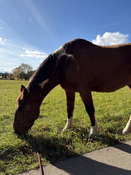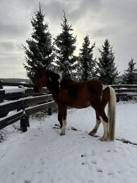 This kind-hearted 19-year-old Paint Cross gelding is looking for a 5-star home with a loving carrot giver! Due to a personal hardship, I am heartbroken to seek a 5-star home for my little treasure. No dealers or commercial interests, please. He is strictly sold as a companion horse! Frequently asked questions: Is he rideable? -> He has not been ridden for several years. Does he have any health issues or limitations? -> He has a soft fetlock on his right hind leg, which he relieves especially in winter. However, he has no restrictions or other issues. According to the veterinarian, movement is beneficial for him. I have never had any problems with it. He also moves without issues. Due to the soft fetlock, he is not a weight carrier. He is capable of covering long distances comfortably; the longest I recently walked with him was 15 km. He has only ever been a pasture horse with me and has not been ridden. He impresses with his absolutely relaxed, calm, and friendly nature. An absolute gem with a big heart. He will do anything for carrots and treats. He loves going for walks and being pampered. His height is approximately 16.1 hands. I wish for him a home where he can simply be a horse. He is very uncomplicated, completely social, and easy to get along with. He would be the perfect companion horse! He is used to box stalls with daily turnout and an open stable. Since movement is very good for him, an open stable would be ideal! Absolutely priority for space over price! I also have two blankets that can be included, as well as various feed. If you have questions or are interested, please contact me and come to see him. No leasing or other arrangements! My health is deteriorating, and time is running out. Pickup before January 6th = €100 Friendship price! He is worth much more normally. I just want to find a loving home for him. Money is absolutely no issue.