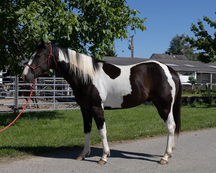À vendre : le poulain Paint Horse né en 2023, BUTTONS JIMBEAM (fils de DD CHAMPAGNE BUTTON x CHARMED WITCH JOSIE), surnommé « JOE ». Joe est à mes côtés depuis qu’il a un an, et je peux affirmer sans hésitation qu’il s’agit du poulain le plus détendu et amical que j’aie jamais rencontré. Il est arrivé par un détour chez moi, initialement prévu pour une courte période, mais j’ai finalement décidé de le garder jusqu’à ses trois ans afin de lui trouver un foyer adapté. Je ne le cède qu’en raison de mes ambitions personnelles, qui ne correspondent pas à ses qualités (et qui ne le feront probablement jamais), d’autant plus que j’ai déjà deux chevaux polyvalents, calmes et exceptionnels à la maison ! Quelques informations sur JOE : - il a toujours été en bonne santé - vermifugé et vacciné régulièrement - ses sabots sont régulièrement entretenus - il reçoit une alimentation minérale de qualité et des compléments - il connaît la vie en groupe (mixte) ainsi que le box avec paddock - il est très sociable, s’entend avec tous les chevaux et est très joueur - il connaît les sorties en main - il a l’habitude de se promener - il pratique le travail à la longe, en liberté dans le round pen, le travail avec des barres, la double longe - il connaît la selle - il supporte le poids du cavalier avec ou sans selle - je l’ai seulement monté sérieusement à trois reprises, il a principalement été monté, désensibilisé, manipulé, etc. - il est très doux avec les enfants - il connaît les chiens, chats, poules, vaches, moutons - il est parfaitement préparé pour une future carrière de cheval de selle - il a été habitué au travail de désensibilisation - il n’est absolument pas peureux et connaît diverses machines agricoles, tracteurs, souffleurs, camions, etc. - il a une très belle silhouette, est bien musclé, mais est encore en croissance - pas de certificat d’aptitude à l’utilisation (AKU) - il connaît le transport en van du box à la pâture, ainsi que le transport depuis l’ancien box - il possède des papiers APHA, un passeport équin et un certificat de transfert Je souhaite lui offrir un foyer idéal. Je ne peux pas prédire s’il sera adapté au sport, car il n’a aucune limitation, et avec suffisamment de temps pour son dressage, il pourrait devenir un cheval très talentueux. Je le vois comme un cheval pour le trail, le horsemanship, le plaisir ou le ranch, ainsi qu’un compagnon familial et de loisir. Il connaît parfaitement les vaches de notre ferme, mais ne montre aucun instinct de bovin ou intérêt particulier pour elles. Je souhaite pour lui une vie en troupe ou en box avec paddock (avec d’autres chevaux), car il adore jouer et s’ennuie rapidement autrement. C’est un cheval avec peu de « go » et plutôt du genre paresseux, mais il est toujours intéressé et participe avec enthousiasme au travail. Il adore les sorties en terrain, où il se montre très fiable. Plus d’informations par message privé ou WhatsApp au +49 163 7829 753. Sur les dernières photos, vous voyez Joe avec sa mère, CHARMED WITCH JOSIE, et sur une autre photo, son père, DD CHAMPAGNE BUTTON. Sur l’image où un autre Paint Horse, un hongre, se tient nez à nez avec Joe, vous pouvez voir son demi-frère, JACK, qui a également été en entraînement chez moi (et le sera à nouveau), et possède les mêmes qualités que mon JOE !