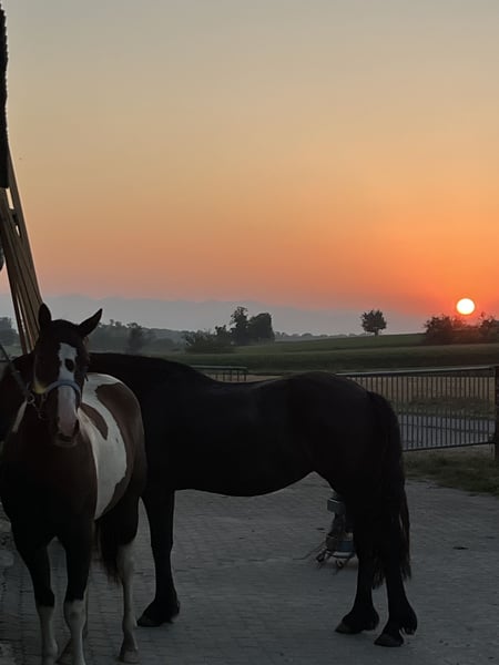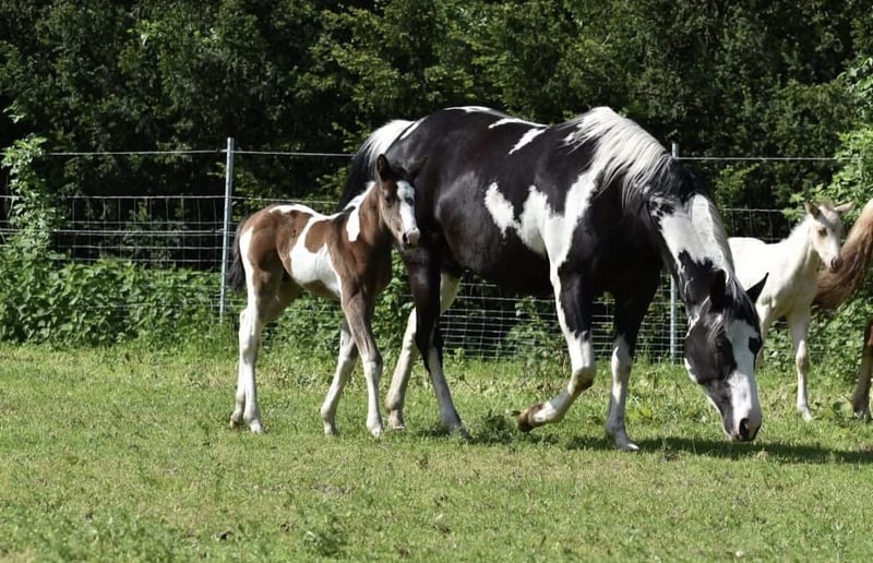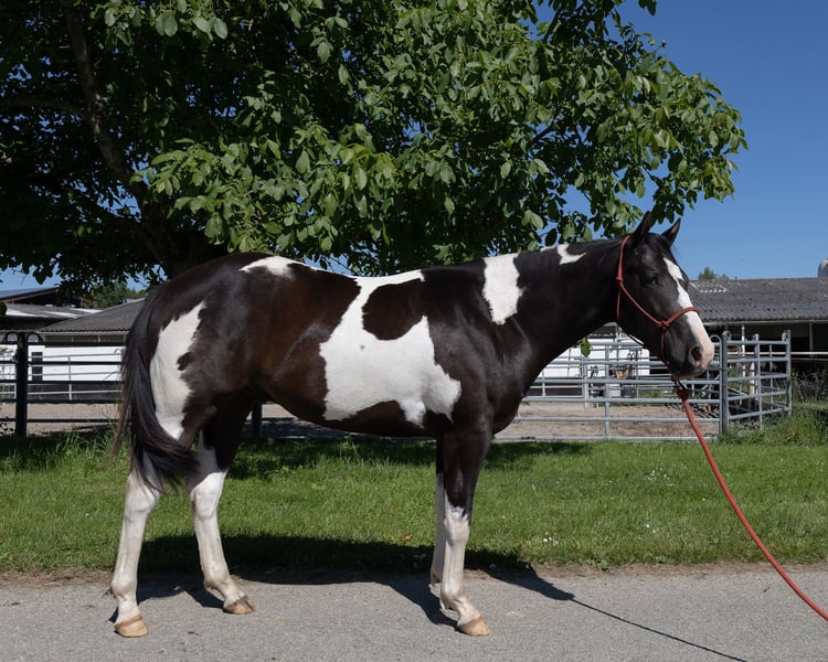 For sale is the 2023-born Paint Horse gelding BUTTONS JIMBEAM (out of DD CHAMPAGNE BUTTON x CHARMED WITCH JOSIE), affectionately known as "JOE." Joe has been in my possession since he was one year old, and I can honestly say he is the most relaxed and friendly young horse I have ever met. He came to me through a roundabout route and was initially only supposed to stay temporarily. Later, I decided to keep him until he is three years old to find him a suitable home. I am only offering this handsome fellow because he does not suit my personal ambitions (nor will he), and I already have two fantastic, calm all-rounders at home! Here are some details about JOE: - He has always been healthy - Regularly dewormed and vaccinated - Regular hoof care - Receives good mineral and supplement feed - Experienced in herd life (mixed herd) as well as box stall with turnout - Extremely social, gets along with all horses, very playful - Has been on pony rides - Knows walking out on a lead - Familiar with ground work (free in round pen, lunging, pole work, double lunging) - Is familiar with a saddle - Can carry rider’s weight with and without a saddle - Has been ridden properly only three times so far; mostly just sat on, mounted, dismounted, etc. - Very gentle with children - Knows dogs, cats, chickens, cows, sheep - Well-prepared for a future as a riding horse - Has experience with desensitization work - Absolutely not spooky; familiar with various farm machinery, tractors, leaf blowers, trucks, etc. - Stands well, well-muscled but still growing - No health certificate (AKU) available - Has been transported in a trailer from stable to pasture and from previous stable to me - Holds APHA papers, equine passport, and transfer report My wish is for Joe to find a truly ideal home. I cannot predict whether he will be suitable for sport, as he has no limitations, and with proper training and patience, he will likely develop into a very talented horse. I see him suited for trail riding, horsemanship, pleasure riding, ranch work, or as a family and leisure horse. He is very familiar with cows from our farm but shows no cow-sense or particular interest in them. I prefer him to be kept in herd or box with turnout (together with other horses), as he loves to play and can get bored quickly otherwise. He is a very laid-back horse with little "go," but he is always interested and fully engaged when working. He loves outdoor riding and is a real asset in the terrain. More information gladly via private message or WhatsApp at +49 163 7829 753. In the last photos, you can see Joe with his mother, CHARMED WITCH JOSIE, and in another photo, his sire, DD CHAMPAGNE BUTTON. In the picture where a second Paint Horse gelding is nose-to-nose with Joe, you see his half-brother JACK, who was also in training with me (and will return) and possesses equally good qualities as my JOE!