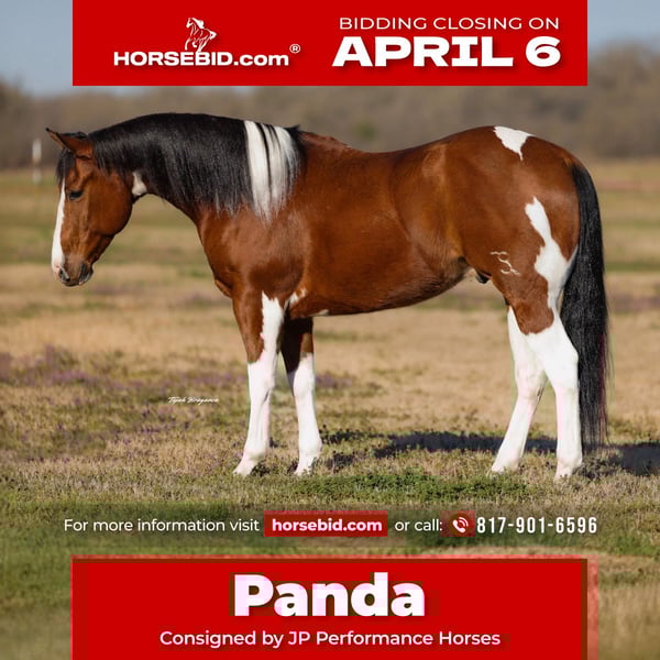 🌟𝑨𝒑𝒓𝒊𝒍 𝐀𝐋𝐋 𝐒𝐓𝐀𝐑 𝐋𝐈𝐍𝐄𝐔𝐏🌟 Happening now thru MONDAY | APRIL 6th - Available EXCLUSIVELY on HorseBid's website! For more details and to register visit: www.Horsebid.com CONSIGNOR CONTACT: JP Performance Horses 817-901-6596 LOCATION: Weatherford, TX BREED: Paint REGISTERED: No COLOR: Bay and white HEIGHT: 15 AGE: 6 GENDER: Gelding Panda is a 6-year-old Paint gelding that checks every single box — looks, brains, talent, and that kind, willing personality everyone wants. This sweet boy is an absolute pleasure to ride and has a solid, correct foundation. He rides one-handed with a true neck rein, has a great stop, and responds to everything you ask with ease. Panda lopes off effortlessly in the correct lead from a standstill, carries a soft, smooth trot and lope, and is just flat-out FUN to ride. ✨ What makes Panda special: • Drop dead GORGEOUS with eye-catching color • One-hand neck rein, broke the right way • Easy transitions, correct leads every time • Soft, smooth trot & lope — super comfortable • Willing, kind, and aims to please Panda is extremely versatile and can go in just about any direction: • Loves to jump • Fantastic on the trails • Would shine in ranch classes, sorting, cow work, or arena events • Equally happy being your dependable, go-to partner for anything And the best part — he is SAFE for anyone to ride. Whether you’re a beginner, a kid, or just want something dependable and enjoyable, Panda is the kind you can trust and enjoy every day. He looks amazing in English tack and loves to jump. We have done cross rails as well as 2 ft jumps and he never hesitates for whatever you ask of him. • Stands great for the farrier • Loads & unloads like a pro • Gets along well in the herd • Up to date on coggins • Recently had teeth floated • Current on worming Panda is the kind that’s hard to find — beautiful, broke, gentle, and versatile. The kind you’ll be proud to own and excited to ride every time you swing a leg over. 📍 Located in Weatherford, TX ✈️ Shipping can be arranged anywhere Feel free to call 817-901-6596 to schedule a time to come try Panda or have a FaceTime call for those who live far away. Don’t miss this one — horses like Panda don’t come around often