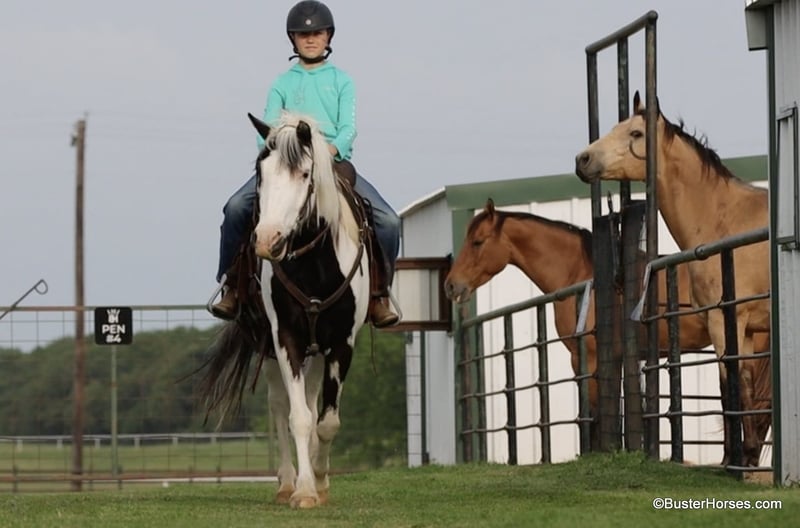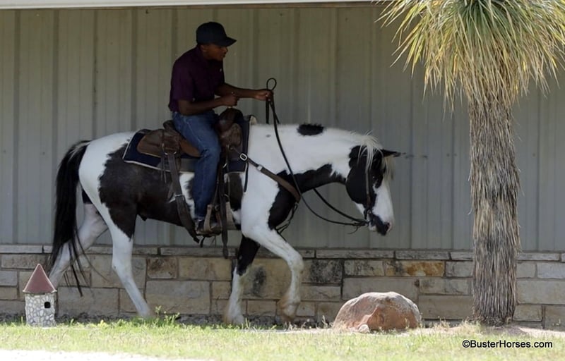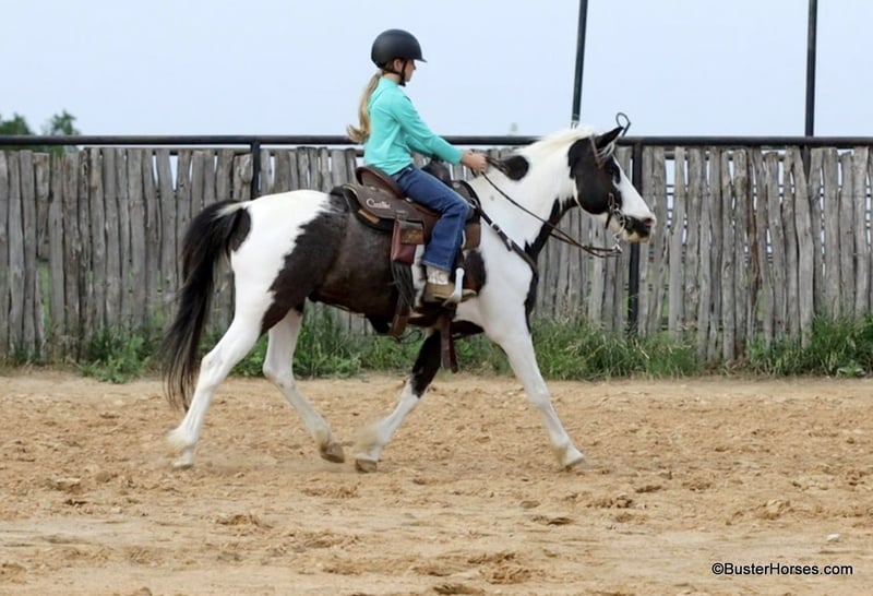 ONLINE AUCTION Place your bids at www.PlatinumEquineAuction.com Starting Bid $3500 Auction ends May 25th, 2025 Need a new saddle? Check out White Rock Saddles on our website or Facebook! If you are looking for a flashy, fun, no-nonsense, sweet, just point-and-go have a good time trail riding companion… then Tonto is your man!!! He is at the perfect age at only 7 years old, he has already been around and seen lots of things, been hauled, been on lots of rides, been in lots of parades … but he is only 7 and still has his whole lifetime in front of him! This sweet little gelding is great-natured, kind, and so extremely simple and uncomplicated to ride. He is as smooth as they come and suitable for just about any level of rider. If you are sitting on him, you feel extremely secure. He is so naturally smooth moving in all of his gaits, that you would have to practically just pick up and bail off of the side of him to be able to come off of this one!!! He is naturally low-headed and will travel on a relaxed rein and neck rein around – but, you can also pick him up and ride with a lot of contact, and he will tolerate just about anything with new rider’s bumbling around being all over on him, in his face, and in his mouth. He has an adorable personality and loves to be around people. He drops his head for the halter or the bridle to be put on, and will stand there relaxed and patient if you have to fumble around and get organized. He could care less about other horses and never knickers or calls back to the barn, super good about leaving the barn and going out alone. He hauls like a perfect gentleman. If you often ride out alone, then this is the one for you. He is great anywhere in the group and has a huge big ground covering almost running walk to him if you push him and ask for it. He is a unique cross that could ride with the regular horses and also keep up with the gaited horses! He loves the water and does not hesitate to cross the creek or go into the pond, he is sure-footed and handles up and down terrain, creek beds, banks, Rocky areas, and thick wooded trees. He pays attention and navigates where he is going. He is great to catch, bridle, saddle, groom, bathe quiet for the vet and the farrier, and just an all-around gentleman! Everybody here adores this sweet horse, he will be with his next partner for a long time! Please do not hesitate to give us a call if you have any questions about him! Ashely at Buster Horses 214-605-7174 Tonto is shod all the way around and is ready to hit any trails that you put in front of him, his feet were just reset last week. Prior to being shod, he was barefoot for quite a while, he has really great feet, and could easily go barefoot again if you were just riding around your place locally. His teeth were just done by our equine dentist last month, and he also had his sheath cleaned, his ears preemptively treated for ticks, and was dewormed at that time. He will arrive to his new owner up to date on everything and ready to go. He is in great shape and in good health. Watch his video, and to see additional videos, go to our website: BusterHorses.com or our Facebook page: Buster Horses Tonto is located in Weatherford, TX – one hour from Dallas / Fort Worth International Airport. He is an easy day trip, or fun overnight trip to come and try out, from anywhere! We are experienced, knowledgeable sellers, and we can help with quickly arranging affordable shipping to any buyer’s location – we have experience shipping worldwide – including regularly to Hawaii, Canada, Mexico, Europe, and South Africa. Check our website for buyer reviews, more videos of Tonto, additional info, etc: BusterHorses.com/Tonto-Paint-Gelding ONLINE AUCTION Place your bids at www.PlatinumEquineAuction.com Starting Bid $3500 Auction ends May 25th, 2025 Need a new saddle? Check out White Rock Saddles on our website or Facebook!