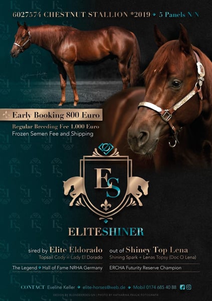 Elite Shiner ist der letzte Sohn von Elite Eldorado (Hall of Fame) aus der Shiney Top Lena. Er stammt aus zwei alten,sehr erfolgreichen Zucht Linien ab. Er ist ein athletischer Beweger, sehr Nervenstark und Chic. Er ist 7 Panels N/N getestet. Es ist ausschließlich Gefriersperma von sehr guter Qualität vorhanden.