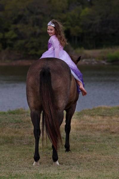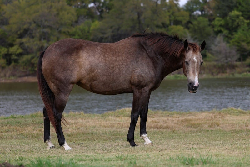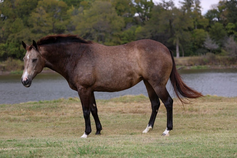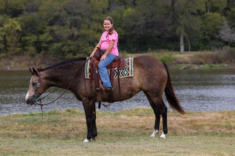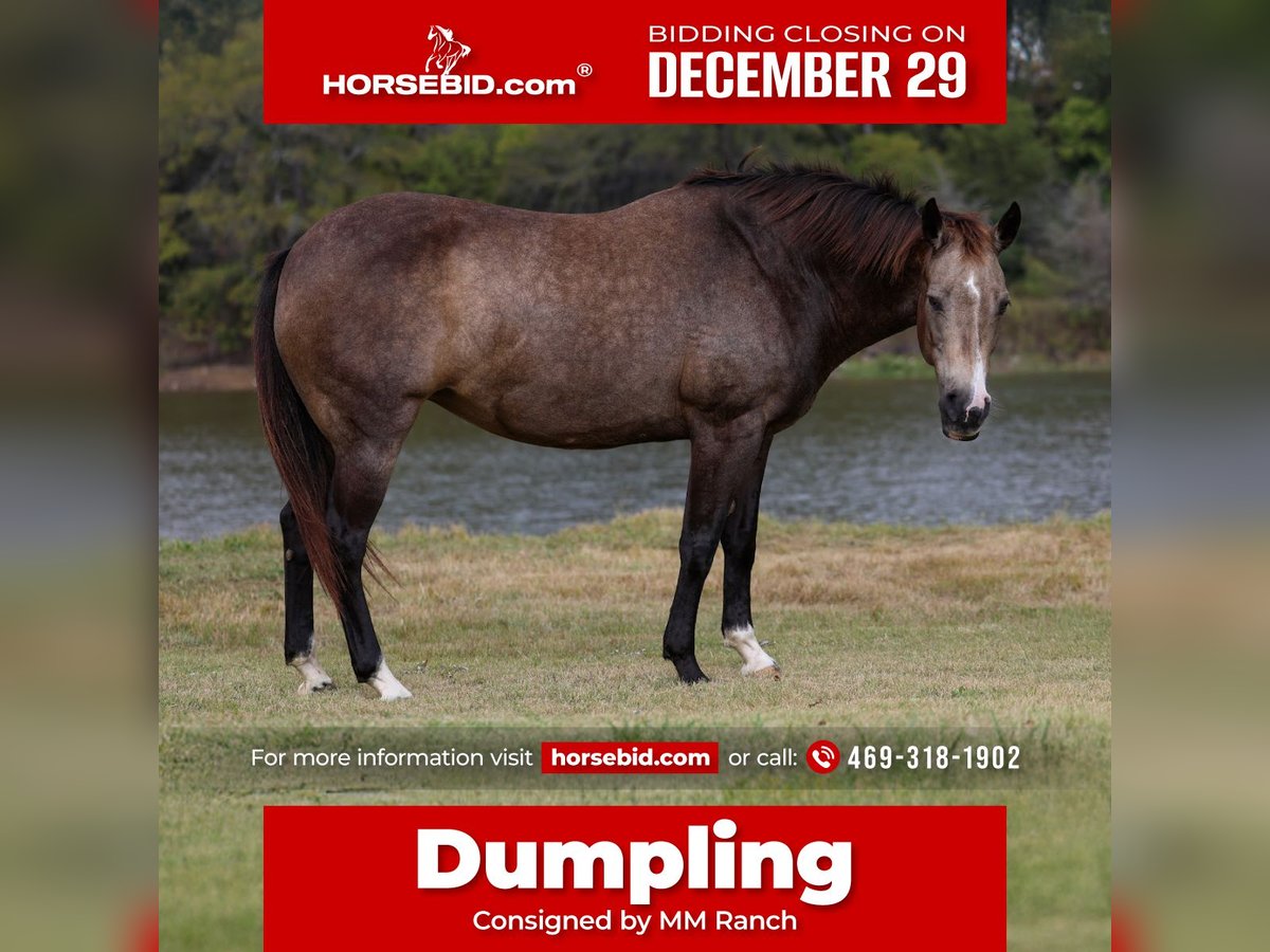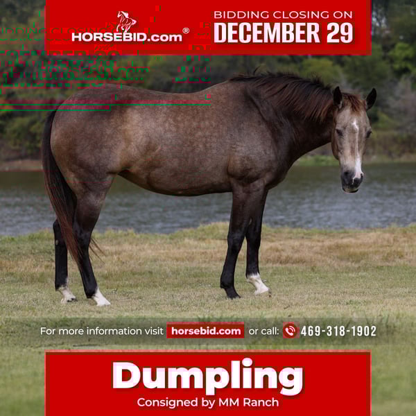 ⚜️𝐓𝐇𝐄 𝓗𝓮𝓻𝓲𝓽𝓪𝓰𝓮 𝐖𝐢𝐧𝐭𝐞𝐫 𝓒𝓵𝓪𝓼𝓼𝓲𝓬⚜️ Happening now thru MONDAY | DECEMBER 29th - Available EXCLUSIVELY on HorseBid's website! For more details and to register visit: www.Horsebid.com CONSIGNOR CONTACT: MM Ranch 469-318-1902 LOCATION: Forney, TX BREED: Quarter Horse REGISTERED: No REGISTERED NAME: Dumpling COLOR: Buckskin HEIGHT: 15 AGE: 12 GENDER: Mare This is 🥟 Dumpling 🥟 , a true one of a kind. She is healthy fat girl that is a dark buckskin with a lighter undercoat with huge dapples everywhere. Lol you could say she has dapples as big as apples. She is an absolutely GLAMOROUS thick mare standing 15 hands tall. She is just as wide as she is tall. 😂 She has the most loving and kind disposition. She is naturally gentle and kind. Doesn’t have a mean bone in her body. Absolutely loves attention from any and everyone. Especially kids!!! Not even an ounce of spookiness. No snootiness or watchiness. Absolutely no bad habits. She is the ultimate sweetheart. She has been used on a big working ranch. She has all the ability and cow sense. She is so talented and smart. And so easy to ride.✨This girl has the best rocking chair smooth lope. She is so refined and elegant. Her trot and lope is Effortless for her!! So fun and easy to ride. You barely have to squeeze to get her to step off in a lope. She is a been there done that type that is ready to go any type of adventure. She has been rode both in and out of the arena. Rode out on the ranch and checked cattle and been on lots of trail rides. Even had some roping done on her and true ranch work done on her. You do not have to be a cowboy to ride her though. 💥 Because the best thing about her is she is absolutely safe and gentle for anyone. I have never seen this mare do anything wrong. No bad habits. Absolutely no quirks or vices about her. ⭐️ She perfect to be mounted. Stands perfect for baths. She will meet you at the gate every time. And comes right up to you and puts her head in the halter. She loves going to work. She wants to please and wants to learn. Absolutely NO warming her up. Just jump on her and go. She is safe for anyone to ride!!! She really has the capability to do anything you want to do on her. You will get noticed riding her. She is pretty. The cherry on top 🍒 is Dumpling is guaranteed 100% in every way. 🌎 We can and will help arrange affordable shipping if needed. She is up to date on all shots and worming. She just had her feet done. She is ready to go to her new home. Call with anymore questions you may have about 🥟 Dumpling 🥟!!!