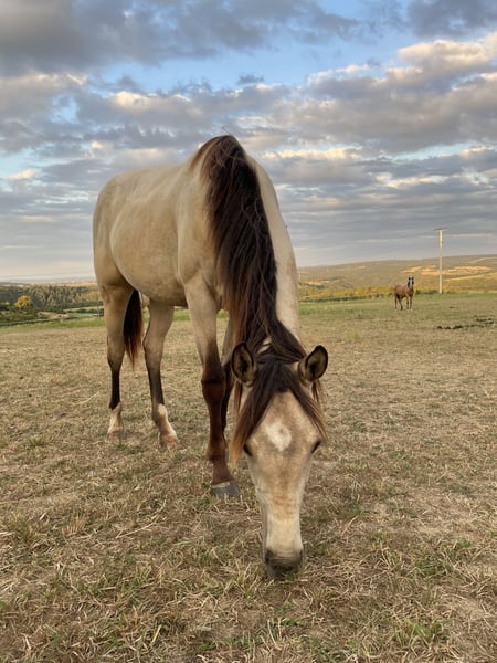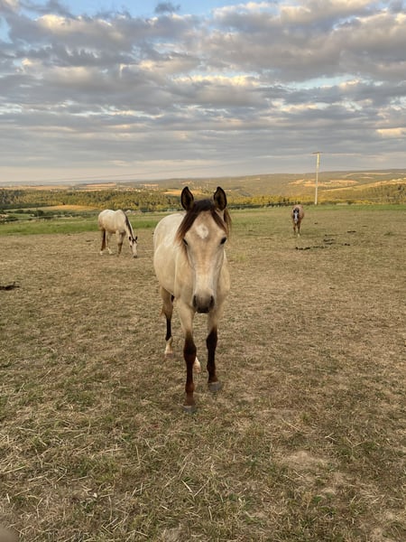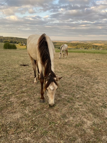 ✨ Ezras Macy Snocks – junge Stute mit Herz & Verstand sucht ihr neues Zuhause ✨ Macy ist eine 2024 geborene Dunskin-Roan-Stute (Endmaß ca. 150 cm) und wächst seit Tag 1 im Herdenverband auf. Sie ist ein absoluter Schatz im Umgang – freundlich, neugierig, mutig und sehr menschenbezogen. 🧡 Von klein auf begleitet sie Ausritte als Handpferd und zeigt sich dabei immer super unerschrocken und gelassen. Sie bringt ein tolles, ausgewogenes Fundament mit, weiche Bewegungen und eine wunderschöne Sonderfarbe. 🦄 Macy im Überblick: • geb. 2024 • ca. 150 cm Endmaß • Farbe: Dunskin Roan • Halfterführig & brav beim Schmied • Regelmäßig entwurmt und geimpft • Von klein auf mit draußen gewesen (Handpferde-Ausritte) • Mutig, unerschrocken, neugierig • Ruhig, gelassen, sozial & ausgeglichen • Wunderschönes Gebäude & Sonderfarbe 📌 Abstammung: • Mama: Honey Soulmate – Suffield Mustang • Papa: MJM Saltys Blue Ezra Macy eignet sich wunderbar für den ambitionierten Freizeitreiter oder Amateursportler, der ein junges Pferd solide ausbilden und gemeinsam wachsen möchte. Sie bringt die Coolness, das Fundament und die Einstellung mit, um später ein vielseitiger, verlässlicher Partner zu werden – ob im Gelände, auf Kursen oder kleinen Turnieren. 🌿 Sie liebt Menschen, kommt immer freudig ans Tor und ist in jeder Hinsicht ein ehrliches, unkompliziertes Pferd, das ihrem Menschen sicher viel Freude machen wird. 💛 Bei ernsthaftem Interesse oder Fragen zu Macy melde dich gerne bei mir!