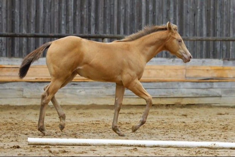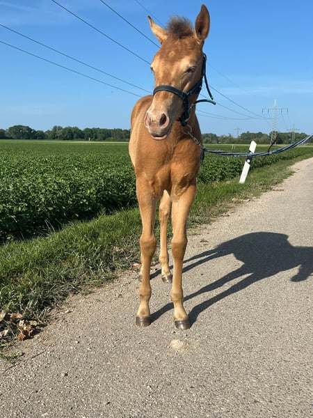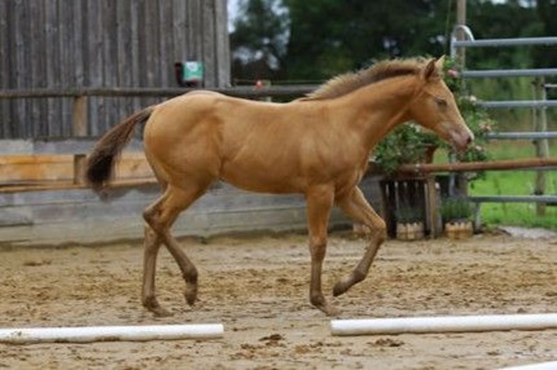 Lady In Champagne - eine außergewöhnlich hübsche Quarter Horse Stute in der seltenen Farbe Amber Champagne, geboren am 08. April 2025. Mit einem geschätzten Endmaß von ca. 150 cm, ihrem korrekten, kompakten Gebäude, der tollen Bemuskelung und ihrem liebevollen Ausdruck ist sie ein echter Eyecatcher - sowohl optisch als auch charakterlich. Als 1a-Prämienfohlen und mit einem 6. Platz beim DQHA Fohlenchampionat 2025 bringt sie bereits jetzt beste Voraussetzungen für eine erfolgreiche Zukunft mit. Sie stammt aus einer hervorragenden Allround-Linie, die viele Möglichkeiten offenlässt - egal ob Sport, Turnier oder Freizeit. Lady In Champagne wächst im Herdenverband auf großzügigen Koppeln auf und zeigt sich dort ausgeglichen, neugierig und sehr menschenbezogen. Sie ist verschmust, cool im Kopf, bewegungsfreudig und lernt schnell. Ihr aufgewecktes Temperament ist dabei stets angenehm und ausgeglichen - ein echtes Goldstück mit klarem Köpfchen. Sie kennt Hufschmied und Tierarzt, wird täglich gehändelt und ist halfterführig. Anhängerfahren, Hufegeben, Putzen sowie das Mitlaufen als Handpferd im Gelände sind für sie bereits vertraut. Lady In Champagne ist gesund, regelmäßig entwurmt, bei Abgabe altersgerecht geimpft und genetisch frei (5-Panel und MHYM n/n). Der Farbtest liegt ebenfalls vor. Ob als späterer Freizeitpartner oder sportlicher Allrounder - diese junge Stute vereint Charme, Qualität und eine auffällige Farbe zu einem rundum gelungenen Gesamtpaket. Sie wird mit vollständigen AQHA-Papieren und Equidenpass in fördernde Hände abgegeben. Ein bezaubernder Youngster mit viel Potenzial - bereit, Herzen zu erobern.