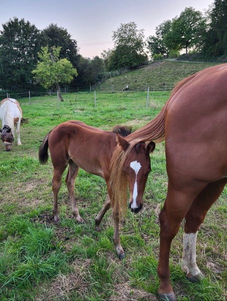 For our "ABBYGALE" (MY BLUE HOT STUFF), we are also looking for a 5-star home. This stunning Quarter Horse mare (born 2025) was born on our farm. Her parents are also located here: Mother: TL Blue Alice (Aint It The Blues) Father: Zippos King Bar Abby is an absolute eye-catcher: Her chestnut coat creates a beautiful contrast to her white blaze and black mane. She has an excellent conformation, and her eyes reflect her curious yet gentle nature. She moves above average and will be suitable for both competitions and leisure riding. So, if you are looking for a little beauty with great potential, Abby is a perfect choice. Abby holds an equine passport from the DQHA, is enrolled in the DQHA Futurity, and has the American registration papers (certificate of registration) from the AQHA. She is currently still with her mother in an open stable/pasture as a foal. She can either stay here for further upbringing or move to her new home once she is no longer nursing. If you would like to meet Abby or have any further questions, please feel free to contact us.
