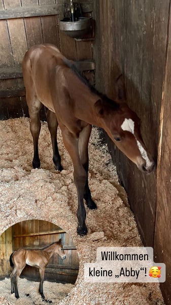 Für unsere „ABBYGALE“ (MY BLUE HOT STUFF) suchen wir ebenfalls ein 5 Sterne Zuhause. Die bildhübsche Quarter Horse Stute (geb. 2025) hat bei uns das Licht der Welt erblickt. Ihre Eltern stehen ebenfalls auf unserem Hof: Mutter: TL Blue Alice (Aint It The Blues) Vater: Zippos King Bar Abby ist eine absolute Augenweide: Ihr braunes Fell bildet einen wunderschönen Kontrast zu ihrer weißen Blesse und der schwarzen Mähne. Sie hat einen tollen Körperbau und ihre Augen spiegeln ihre neugierige aber sanfte Art wieder. Sie bewegt sich überdurchschnittlich gut und wird sowohl für Turniere als auch für Freizeit geeignet sein. Wer also eine kleine Schönheit mit viel Potenzial sucht, landet mit Abby einen Volltreffer. Abby besitzt einen Equidenpass der DQHA, ist DQHA Futurity einbezahlt und besitzt die amerikanischen Papiere (certificate of registration) der AQHA. Sie steht derzeit noch mit ihrer Mutter bei uns im Offenstall/auf der Weide als Saugfohlen. Sie kann entweder hier zur weiteren Aufzucht bleiben oder in ihr neues Zuhause umziehen, sobald sie kein Saugfohlen mehr ist. Wenn Sie Abby kennenlernen möchten oder weitere Fragen habe, schreiben Sie uns gerne einfach an.
