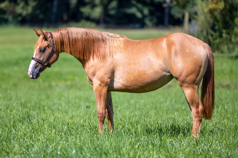 Stutjährling, geboren im Februar 2024 von JP K PAX aus der Custom Barbi Gay (Custom Crome x Smart Chic Olena) doppelt registriert 6 Panel N/N Toffee wächst artgerecht in der Herde auf großen Weiden auf. Sie wird regelmäßig dem Hufschmied vorgestellt, entwurmt und geimpft. Starke Beine, große Hufe - wird kräftig! Endstockmaß ca 152cm