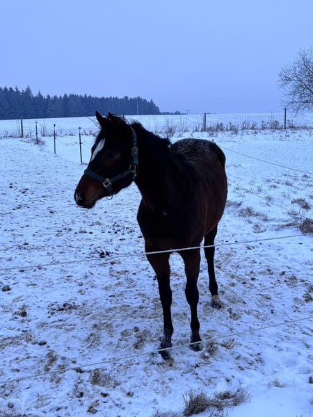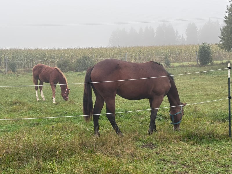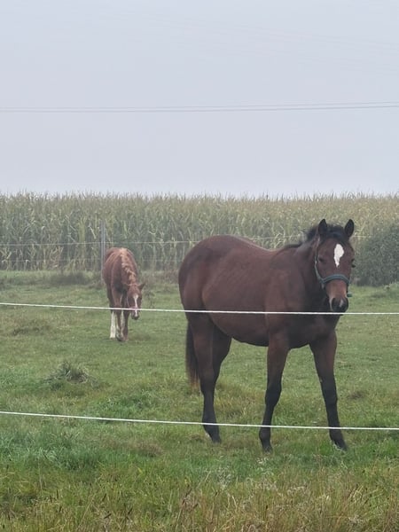 My Blue Charm - die am 01.03.2024 geborene Quarter Horse Stute ist ein echtes Nachwuchstalent mit bester Allround- und Pleasure-Abstammung. Sie ist aktuell ca. 145 cm groß und wird voraussichtlich ein Endmaß von etwa 155-160 cm erreichen. Mit ihrer ausdrucksstarken braunen Farbe, dem harmonischen Gebäude, der ausgewogenen Bemuskelung und ihren korrekten Beinen mit gesunden, starken Hufen überzeugt sie schon jetzt auf ganzer Linie. Rose ist gesund, 5-Panel n/n, gut entwickelt und wurde artgerecht im Herdenverband aufgezogen. Sie kennt sowohl die Box mit täglichem Weidegang als auch das Leben auf dem Paddock und zeigt sich in der Herde absolut sozial und umgänglich. Im täglichen Umgang präsentiert sie sich aufmerksam, freundlich und sehr menschenbezogen. Rose ist aufgeschlossen, neugierig, unkompliziert und lernt schnell. Ihr ruhiges, angenehmes Wesen in Kombination mit einem wachen Geist macht die Arbeit mit ihr besonders angenehm. Ob beim Tierarzt oder Hufschmied - sie zeigt sich stets brav und gelassen. Geimpft, entwurmt und gechippt ist sie bestens versorgt und kennt bereits das kleine Fohlen-Einmaleins. Auch an Umweltreize wie Landmaschinen, Hunde und Kinder ist sie gewöhnt. Ihre Bewegungen sind fließend und vielversprechend für den späteren Einsatz im Pleasure- oder Allroundbereich. Futurity startberechtigt!! My Blue Charm bringt alles mit, was man sich von einem jungen Pferd wünscht - eine tolle Basis für Sport, Freizeit oder Zucht. Kann zu attraktiven Konditionen zur Aufzucht bleiben. Auf Wunsch kann die Bezahlung in zwei Raten erfolgen.