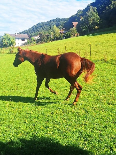 TINA - une magnifique jument, douce dans le comportement et curieuse de tout. Elle grandit en famille. Elle est issue de lignées de Topsail Cody. Correcte, dotée de très belles allures. 6 Pan n/n. Son père I am a Ruf Boy transmet à ses descendants son caractère calme, un excellent physique et de superbes mouvements. Il est inscrit au stud-book performance de la DQHA. Réalisations : double champion Futurity Open 2015, qualifié pour la World Show Junior Reining Open 2015, médaille d'argent à la Championnat d'Europe AQHA HSB Reining Open 2016, médaille d'or au Championnat jeunes chevaux Reining GO 2016, 5ème place au Breeders Derby Open, trophée de bronze Champion, et bien d’autres. Vidéo disponible via WhatsApp : 0043 664 7312 7655