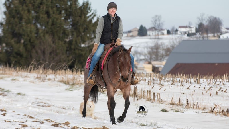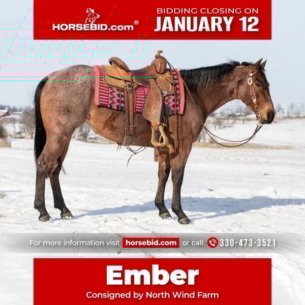 ♦️𝐍𝐄𝐖 𝐘𝐄𝐀𝐑'𝐒 𝑬𝒙𝒕𝒓𝒂𝒗𝒂𝒈𝒂𝒏𝒛𝒂♦️ Happening now thru MONDAY | JANUARY 12th - Available EXCLUSIVELY on HorseBid's website! For more details and to register visit: www.Horsebid.com CONSIGNOR CONTACT: North Wind Farm 330-473-3521 LOCATION: Fredericksburg, OH BREED: quarter horse REGISTERED: No REGISTERED NAME: Ember COLOR: bay roan HEIGHT: 14.1 AGE: 4 GENDER: Mare Ember is a 4 yr old grade quarter horse mare standing at 14.1hh. She is well trained to ride! Ember is very sweet and gentle. She has good manners! She is a great trail horse and takes new places in stride! She stands nicely to be groomed and for tacking up! She will also stand when getting bathes! She can be turned out with other horses and is easy to catch! She rides great in the arena, she has easy cues and responds well! She has A smooth and is easy to ride walk, trot, lope! She has a nice neck rein and a side pass! She can be rode bareback and bridles! She has a lot of trail experience! She rides through creeks, through brush, and is surefooted! She doesn’t mind the tarp or the ball! She is used to being around dogs and atvs! She can be rode out in the traffic and is traffic safe! She is confident and easy going! Ember is the same horse everyday. She is cute, safe, and so much fun to ride! Ember is looking for her forever person, reach out with any questions you might have about her! ⭐️North Wind Farm is renowned for its quality trail and all-around horses. Our horses are versatile and can excel in any discipline, making them perfect for riders of all levels. Whether you're looking for a reliable trail companion or a horse that can perform in various disciplines, North Wind Farm has the perfect match for you. Our commitment to excellence and passion for equine care ensures that each horse is well-trained, healthy, and ready to meet your needs. Contact us: Tim (330)600-8840 Lisa (330)473-3521