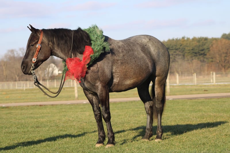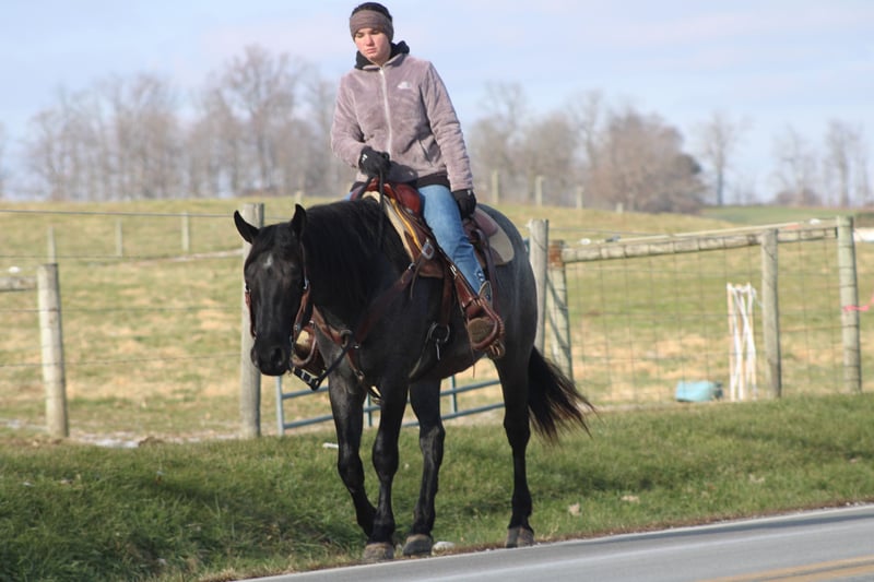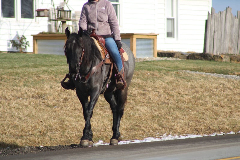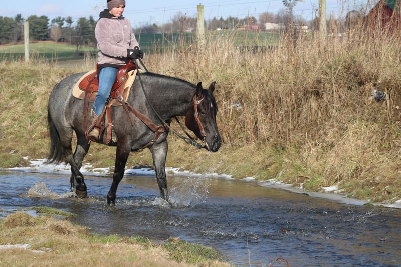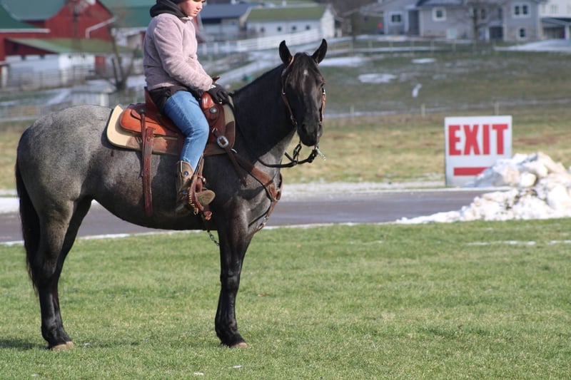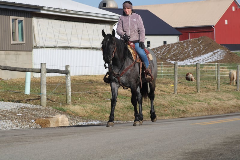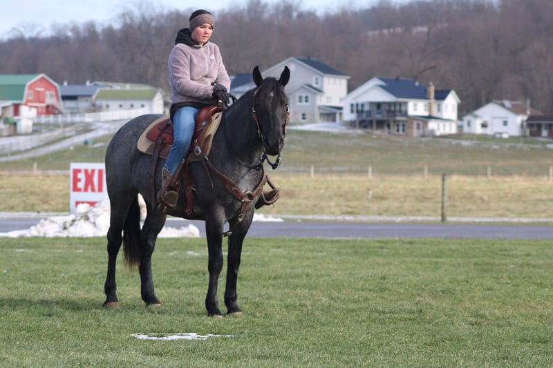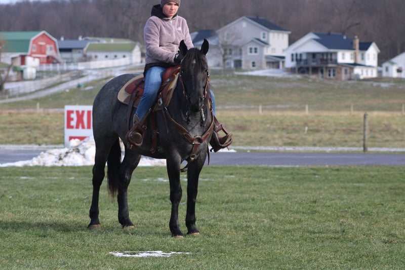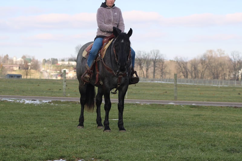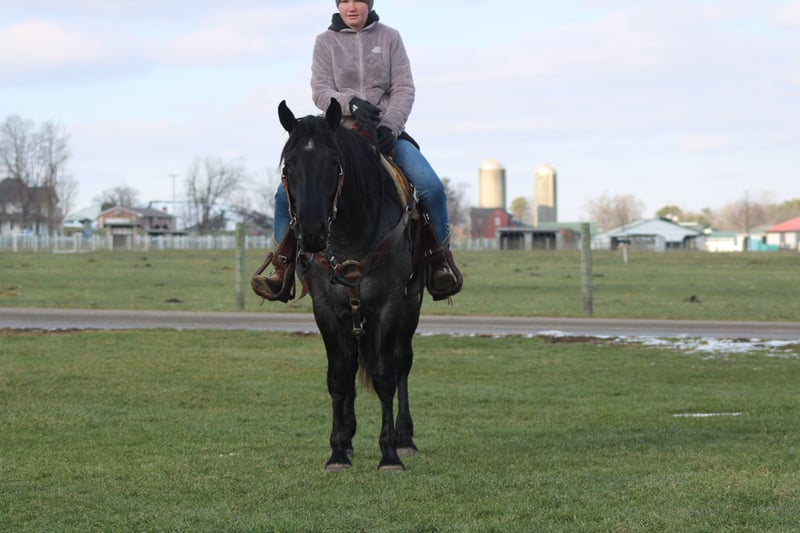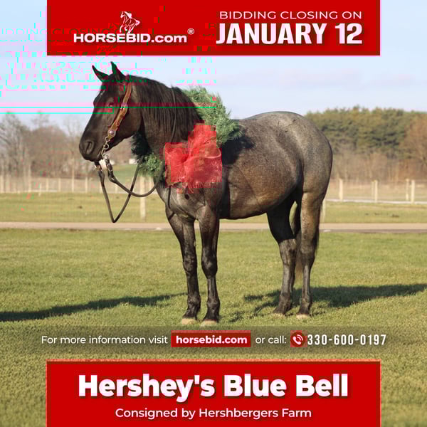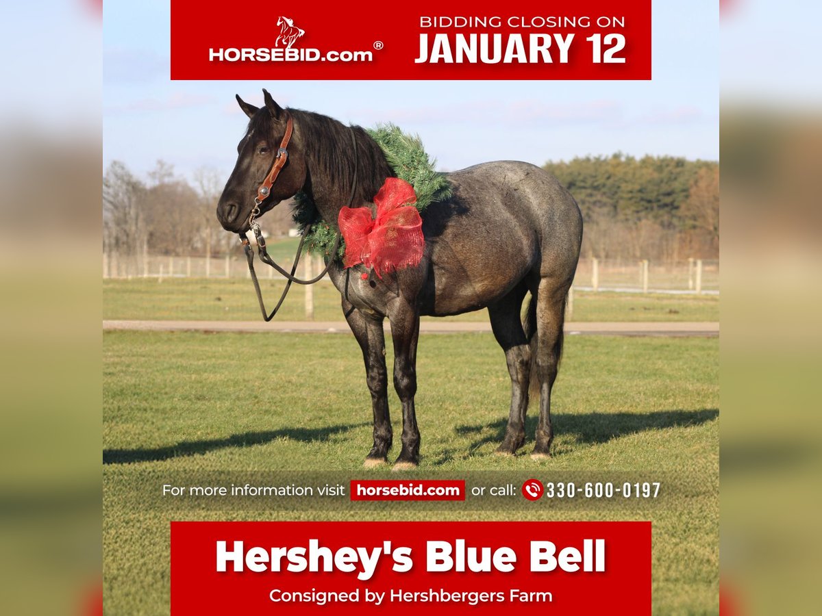 ♦️𝐍𝐄𝐖 𝐘𝐄𝐀𝐑'𝐒 𝑬𝒙𝒕𝒓𝒂𝒗𝒂𝒈𝒂𝒏𝒛𝒂♦️ Happening now thru MONDAY | JANUARY 12th - Available EXCLUSIVELY on HorseBid's website! For more details and to register visit: www.Horsebid.com CONSIGNOR CONTACT: Hershbergers Farm 330-600-0197 LOCATION: Millersburg, OH BREED: Quarter Horse Cross REGISTERED: No REGISTERED NAME: Hershey's Blue Bell COLOR: Blue Roan HEIGHT: 15 AGE: 4 GENDER: Mare Hershey's Blue Bell is a 4 year old Percheron X Quarter Horse mare!! She is very gentle and laid back for her age. "Bell" as we call her most times has been trail ridden a lot and loves to go through water. She is very safe in heavy traffic and doesn't mind the big trucks. Bell picks up both leads and has a nice smooth lope. She stands nice for the farrier and also doesn't mind the clippers. She is easy to catch in the pasture and stands nice to mount. Here is a mare with a lot of future!!! For more info call or text John @ 330-600-0197