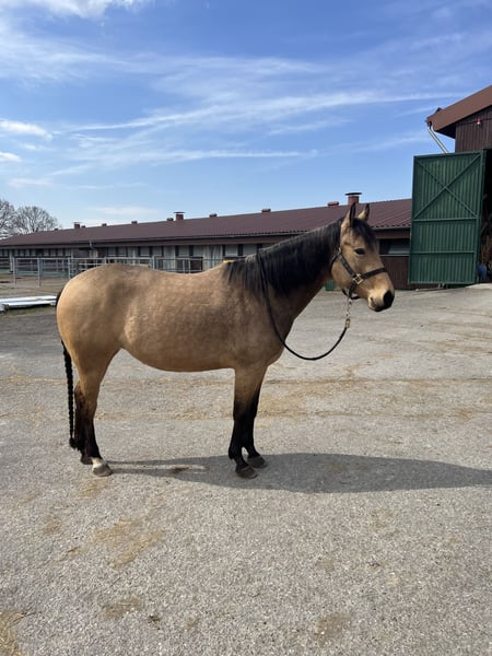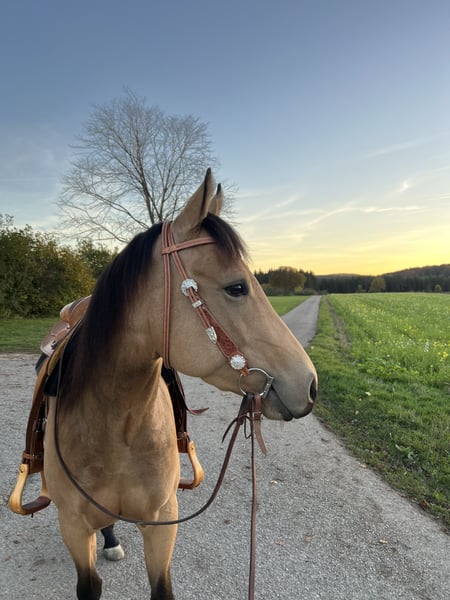 For my sweet 5-year-old Quarter Horse mare, Gigi, I am seeking a new, loving home. Gigi impresses with her cool, motivated nature and her eagerness to learn – she quickly and gladly takes on new tasks. She is very affectionate and enjoys cuddling. In handling, she is well-behaved and straightforward, familiar with the farrier and trailer, and confidently manages new situations and environments. Gigi knows trail riding, groundwork, desensitization training, as well as liberty work, and she remains very calm for her age. Currently, she lives in a herd with five other mares and feels very comfortable there. Due to a previous issue with her front legs, which has already been treated, she is currently viewed primarily as a leisure horse with potential for small competitions. X-rays are available and can be viewed by serious interested parties. Gigi is an excellent partner for riders seeking a reliable, sensitive, and eager-to-learn horse who enjoys growing together and developing their skills. +49 1515 6192812