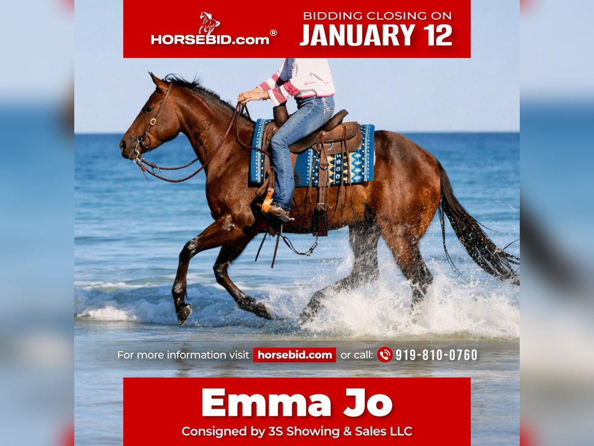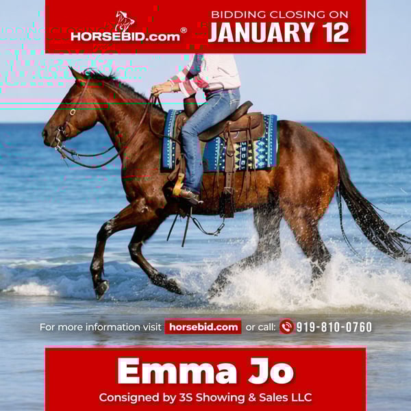 ♦️𝐍𝐄𝐖 𝐘𝐄𝐀𝐑'𝐒 𝑬𝒙𝒕𝒓𝒂𝒗𝒂𝒈𝒂𝒏𝒛𝒂♦️ Happening now thru MONDAY | JANUARY 12th - Available EXCLUSIVELY on HorseBid's website! For more details and to register visit: www.Horsebid.com CONSIGNOR CONTACT: 3S Showing & Sales LLC 919-810-0760 LOCATION: Ocala, FL BREED: QH REGISTERED: Yes REGISTERED NAME: Streakin Fame On Fire COLOR: Bay HEIGHT: 15.3 AGE: 4 GENDER: Mare ✨ 4-Year-Old | 15.3 HH | Registered AQHA Mare ✨ “Emma Jo” is a beautifully started young mare with a rock-solid brain and an exceptional mind for her age. She is quiet, honest, and uncomplicated, making her a standout for someone wanting a young horse with real miles and confidence already installed. Of course, she is still a coming 4-year-old and will continue to benefit from finishing, but we truly can’t think of much more we could do with her at this stage. Emma Jo has been ridden extensively outside the arena. She has been ridden down the road, into town, and to the beach where she confidently walked straight into the crashing waves. She has also been to the cross-country course where she has jumped logs, coops, and a gate, and willingly goes through the water without hesitation. Under saddle, Emma Jo is a very pleasant ride. She has a great rhythm over fences, stays relaxed, and is never in a rush. She is more woah than go, but not lazy. She is very much a float-the-reins type that stays soft, balanced, and steady. She knows her leads, has a great “woah,” is good with bouncy balls, has been exposed to cattle, and will confidently carry a flag. Emma Jo is barefoot and sound. She loads, ties, and cross ties with ease. She lives comfortably in a mixed herd with mares and geldings and is also happy being ridden out alone. Our 10 year old rider, Hazel, rides Emma Jo both solo and double with friends! This is a quality young mare with the brain, exposure, and temperament that is hard to find. She is equally happy English or Western. Easy enough for a 4-H kid to finish her. Your husband can hop on in a western saddle and enjoy a quiet trail ride in the woods, down the road, or at the beach. She is a true all-around prospect—ideal for hunters, trails, foxhunting, eventing, or a pleasure home. She is a good mover and is registered if you wanted to go horse show her! Easy keeper. Don’t miss out. We welcome you to come spend the day with her—we’re very excited to show her off! Shipping is available.