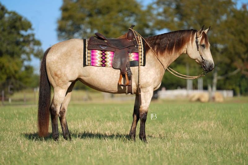 🎄𝐓𝐇𝐄 𝑯𝒐𝒍𝒊𝒅𝒂𝒚 𝐂𝐋𝐀𝐒𝐒𝐈𝐂🎄 Happening now thru MONDAY | DECEMBER 15th - Available EXCLUSIVELY on HorseBid's website! For more details and to register visit: www.Horsebid.com CONSIGNOR CONTACT: LB Equine Sales, LLC 214-449-8028 LOCATION: Terrell, TX BREED: AQHA REGISTERED: Yes REGISTERED NAME: Hook Line and Sinker COLOR: Buckskin HEIGHT: 15.2 AGE: 8 GENDER: Mare Hello, gorgeous! Sylvie is here to sprinkle holiday magic your way! This dreamy dappled buckskin mare is picture-perfect — think Barbie elegance with real-world rideability (and comfort -no less). Her kind baby doll face draws you straight in and stops you right in your tracks—substance, poise, presence, a kind eye, and effortless beauty all in one complete package. Channeling all the old lady energy right over here– (she requests: cookies, peppermints, shoulder/belly scratches, and the full princess treatment!!). By ‘VS Flatline’ and out of a foundation mare, this 15.2H, 2017, AQHA registered mare is the type that never goes out of style! By VS Flatline, a Million Dollar sire himself, 5x All American Quarter Horse Congress Champion, AQHA World Champion, NSBA World Champion! Sylvie floats across the ground, is fancy-broke, and gentle as they come. Comfortable, easy, predictable, and fun to ride – Sylvie can go western and english. She has a lovely pitter patter jog and will step up into a ground covering extended trot. Her canter is LOVELY – like riding in the world’s softest rocking chair. Sylvie will take care of her rider. She is light, soft, and responsive in her aids. She loves to work for you and is a huge people pleaser. She has been used for basic ranch chores AND has been lightly pasture roped off of! She walks right through the water confidently, crosses bridges, great with traffic/cars weaving around her, good with dogs, and has been used on cattle a bit. Sylvie has never offered to buck, rear, or bolt. Stands great for the farrier, cross ties, clips, easy to catch, loads/backs out, not quirky or stand off-ish on the ground, she is right in your pocket and ADORES attention/scratches/grooming. Sylvie is kind and is not “mare-ish” or sassy which I appreciate in a mare. She has been taken on numerous trail rides and been shown at the local ranch riding series. Ride her, breed her, or do both- she is a solid investment! You are guaranteed to own one of the prettiest mares in the barn. 100% sound, no maintenance, no vices, never injected, zero navicular or feet issues! Sylvie is an easy keeper and happy to be up in the barn (corner pooper) or turned out with friends. Sylvie has a recent PPE on file – with a full set of x rays ready to send for your vet to review. Current coggins, recently dewormed, vaccinated, and teeth floated in November by an equine dentist. All records meticulously kept on this mare. AQHA/ NSBA papers and bill of sale paperwork is in order, ready to transfer, and will be signed between buyer and seller at the end of the sale. Wears a size 78-80” blanket and is slick coated, she has been under lights since September. She is 5 panel negative per her papers. Shipping available nation-wide.