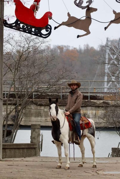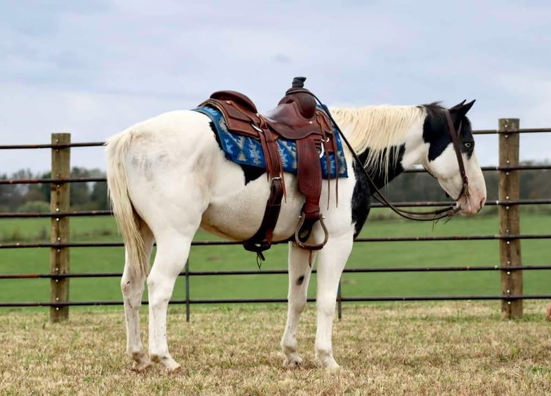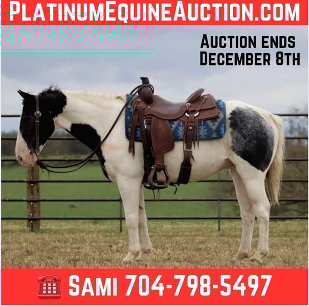 ONLINE AUCTION Place your bids at www.PlatinumEquineAuction.com Starting Bid $3500 Auction ends December 8th, 2024 Need a new saddle? Check out White Rock Saddles on our website or Facebook! “Charlie” is an 8 year old blue roan tobiano grade gelding standing 14.1 hands. Charlie is as wide as he is tall and is a fantastic all-around gelding who is fun for all levels of riders. He is excellent on the trails and crosses water, goes over logs, and rides up and down banks with ease. He also has lots of urban miles under his belt and is traffic safe! Big trucks, motorcycles, or cars don’t phase him one bit. He has been a play day horse and has competed in all kinds of different events at local shows and is great on the ranch. He is comfortable around cattle, will wade right up into the pen of steers and move them wherever you ask, has loaded trucks, and been ranch roped off of. Our toddlers love to groom him and lead him around and he is quiet enough for them to do leadline events off of and even start to ride independently around the arena with supervision. There isn’t much you can ask of Charlie that he won’t do. He is a wonderful family gelding that we trust and enjoy! Charlie hauls well and most recently spent a couple weeks in the Colorado Rockies on an elk hunting trip. He ties out on the highline or does well in a pen for overnight camping. He stands tied well and is good for the vet and farrier. Charlie is an unbeatable gelding for the family. For more information, please call or text Sammi Waugh 704-798-5497. Located in Brooksville, KY. ONLINE AUCTION Place your bids at www.PlatinumEquineAuction.com Starting Bid $3500 Auction ends December 8th, 2024 Need a new saddle? Check out White Rock Saddles on our website or Facebook!