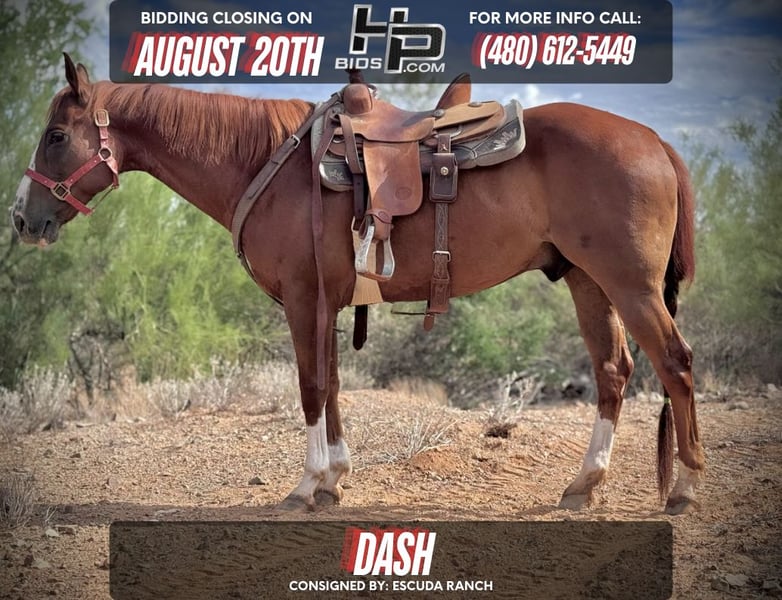 🔥 Happening NOW thru August 20th - Available EXCLUSIVELY on HP Bid’s website! For more details and to register visit: https://hpbids.com CONSIGNOR CONTACT: ESCUDA RANCH - (480) 612-5449 LOCATION: Phoenix, AZ BREED: American Quarter Horse REGISTERED: No REGISTERED NAME: N/A COLOR: Sorrel HEIGHT: 14.3 AGE: 10 GENDER: Gelding 💨 Dash – The Ultimate Gentleman's Ride!🐴 Meet Dash – a grade 10-year-old sorrel gelding standing at 14.3 hands with all the handle and class you could want in a horse. Dash is extremely well-mannered both on the ground and under saddle. He stands tied quietly, loads effortlessly into the trailer, and you can mount and dismount from either side without a fuss. Under saddle, Dash is very broke and has been trained to a high level. He spins both ways like a reiner, has been roped off of extensively, and carries himself with ease. His slow, collected canter is to die for, and he can transition into it from a walk with a smoothness that’s hard to find. That said, Dash does have a lot of buttons — so while he’s gentle, safe, and respectful, he’s not ideal for a total beginner. A handy kid or confident, slightly above-beginner adult will get along with him great. It’s not a matter of bad behavior — Dash does NOT buck, rear, or crow-hop, even after months off. He’s simply responsive and well-trained, and a rider who’s too green might give him unclear cues that could confuse him. He also loves trail riding, is not spooky, and gets along well with other horses on the trail. He’s fantastic for the farrier, easy to catch, and a joy to have in the barn. If you're looking for a horse with tons of training, a willing attitude, and a rock-solid mind, Dash could be your perfect match. Come try him out and see why everyone falls in love with this kind, capable gelding! 🐴✨