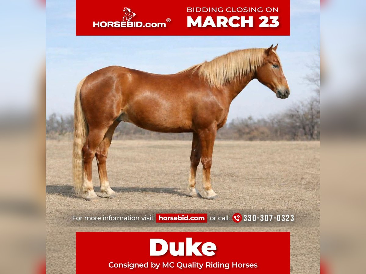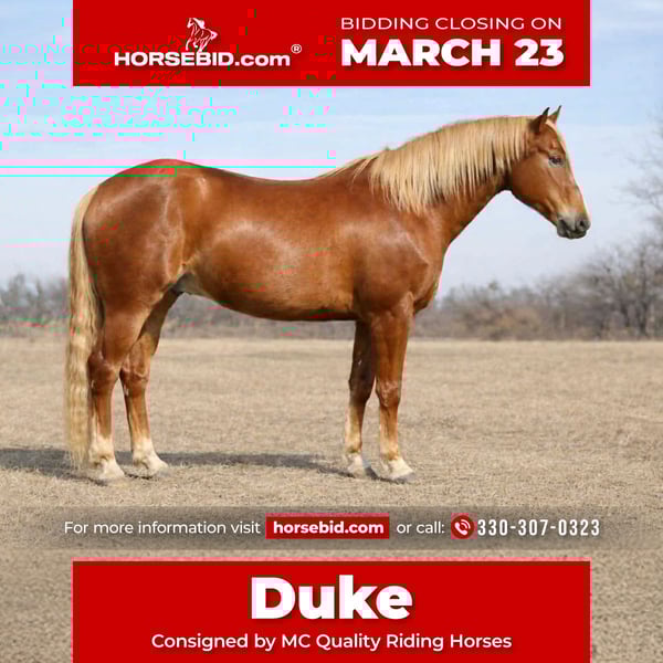 ⚜️𝓽𝓱𝓮 𝐆𝐎𝐋𝐃 𝓢𝓮𝓵𝓮𝓬𝓽⚜️ Happening now thru MONDAY | MARCH 23rd - Available EXCLUSIVELY on HorseBid's website! For more details and to register visit: www.Horsebid.com CONSIGNOR CONTACT: MC Quality Riding Horses 330-307-0323 LOCATION: North Bloomfield, OH BREED: Quarter Horse REGISTERED: No COLOR: Sorrel HEIGHT: 15 AGE: 10 GENDER: Gelding Meet Duke! The kind everyone hopes to find. Standing a solid 15 hands tall, Duke is a stout, well-built Quarter Horse gelding that is clean legged, straight, and correct every way. Horses with his combination of mind, build, and heart are getting harder and harder to come by. Duke isn’t just good looking—he’s the total package. He travels out calm and collected with a naturally low headset and smooth, pretty movement in every gait. He has a soft, collected stop, easy reverse, and is extremely user-friendly, making him a great partner for riders of many experience levels. He’s also been used in summer camps to teach children the fundamentals of riding and horse care, showing just how patient and willing he is. This gelding has proven himself to be versatile, dependable, and honest. He has been used around the ranch where he is reliable and sensible, and out on the trails he’s a quiet, steady mount that will go wherever you point him. Duke confidently crosses water, bridges, brush, and rough terrain and takes new surroundings in stride. He’s also good with traffic and everyday sights and sounds. On the ground, Duke is just as enjoyable as he is under saddle. He stands quietly for saddling, is great for the farrier, clips easily, and has excellent stall and pasture manners. He loads and hauls quietly in any trailer and handles new environments with a calm, willing attitude. Duke has the kind of puppy dog personality that makes him a barn favorite. He genuinely enjoys people, thrives on attention, and always aims to please his rider. Whether you’re looking for a trustworthy trail companion, a family horse, or a versatile gelding to enjoy in multiple disciplines, Duke checks all the boxes. He’s not just a nice horse—he’s a partner, a confidence builder, and one you’ll look forward to riding every single day. Horses like Duke don’t come along often, and when they do, they’re usually the ones people never let go of. If you’re looking for a kind, versatile Quarter Horse gelding with an exceptional mind, Duke is the real deal.