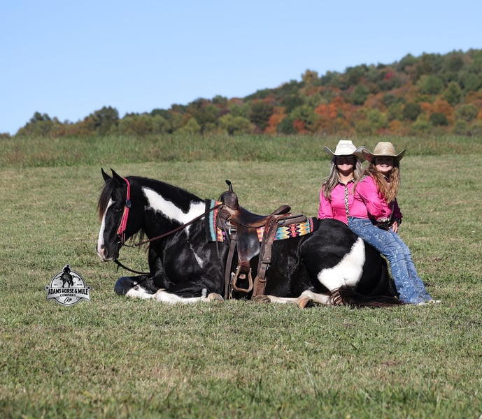 He is consigned to the COWGIRL CADILLACS Sale in Wickenburg, AZ on February 20-21st. You can bid online or bid in person. There is a preview day before the sale or you can come ride him prior to the sale in Mt. Vernon, KY. Register to bid at www.CowgirlCadillacs.com More info at www.AdamsHorseAndMuleCo.com $10000 starting bid Summer Bandit, the only thing that this bandit would steal is a kiss!!! Bandit is a 15.1hh, 2016 model registered American Paint Horse, gelding with beautiful markings, he is stout built with muscles upon muscles with that long flowing mane and tail he belongs on the cover of a magazine… Bandit has been a special horse to us since we started him back in 2019 when he was a 3 year old. We knew from the start that he was a special horse! He was so smart, so friendly and easy going, that training was a breeze! Bandit cruised right through our natural horsemanship program where he learned to ride bridleless, learned to lay down and learned how to set. Since those days Bandit has been trail ridden countless miles. He has been camping and ridden in multiple states surrounding Kentucky, also including Pennsylvania and Missouri. Bandit has been ridden by all ages of beginners, all of our kids and he is totally safe and easy going! He has been ridden around the ranch, penned and sorted cattle. He has been hauled to rodeos, carried the flag for the grand entry, penned and sorted the bulls and our girls used him to give pony rides on where kids and adults lined up to take him for a spin! The lights, speakers, crowds… nothing phases him! Bandit is simple and easy to ride, he has a smooth trot, takes his leads in a smooth easy to set lope and will lope nice circles on a draped rein. He neckreins around, has a good stop, sidepasses to open/shut gates and backs with ease. Bandit has been exposed to all kinds of wildlife and is traffic safe. We have ridden him through town, the drive thru and past Wal-Mart as well. Bandit is great on the trails, as he has carried our kids through rocky terrain, across deep water, up/down slopes and across deadfall. He is not spooky and has been around tarps, wind dancers, bull whips and gun fire. In addition to riding western he has been ridden English and has been over the jumps! Bandit holds steady coming into the jumps and lands balanced. Bandit enjoys grooming time with the kids, where he will get scrubbed down, washed off and braided up, he is Mr. Personality! If you need a safe horse that the whole family can enjoy whether that be around the ranch, on the trails, over the jumps or one to just lay down and take a nap with… Bandit is available to ride and see in Mt. Vernon, KY until the week of the sale Feb. 16-21. Call for more info or if you have any questions 606-308-2461. Go to visit our website for more pics and a video www.AdamsHorseAndMuleCo.com AHAMC has been in the horse business and sold horses over the internet since 2005. We have a long track record of success with hundreds of happy customers. We work hard to match riders with the correct horses and specialize in beginner safe, family friendly horses that have been used and checked out by our family! We can set up transportation anywhere in the US and look forward to working with you. He is consigned to the COWGIRL CADILLACS Sale in Wickenburg, AZ on February 20-21st. You can bid online or bid in person. There is a preview day before the sale or you can come ride him prior to the sale in Mt. Vernon, KY. Register to bid at www.CowgirlCadillacs.com More info at www.AdamsHorseAndMuleCo.com $10000 starting bid