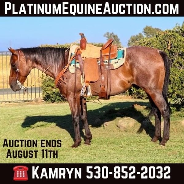 ONLINE AUCTION Place your bids at www.PlatinumEquineAuction.com Starting Bid $3500 Auction ends August 11th, 2024 Need a new saddle? Check out White Rock Saddles on our website or Facebook! Meet Arlo a 11 year old 15 hands Bay Roan Gelding! If you’re searching for the horse that combines trail expertise, obstacle proficiency, and an unbeatable friendly disposition, look no further than Arlo. This remarkable gelding has proven time and again that he is the easiest horse to own, offering a seamless and enjoyable riding experience for both intermediate and experienced riders. Arlo excels on the trails, effortlessly navigating through a variety of terrains and obstacles. Whether you’re crossing streams, traversing steep hills, or maneuvering under low-hanging branches, Arlo takes it all in stride. His confidence and surefootedness make him the perfect partner for any trail adventure. Arlo’s impressive resume includes extensive work on obstacle courses. He has confidently crossed bridges, including teeter-totter and swaying bridges, and navigated through pool noodles and waterfalls. His ability to calmly and smoothly handle these challenges sets him apart from other horses. In the arena, Arlo is a dream to ride. His trot is smooth and easy, while his canter is as silky as butter, ensuring a comfortable and enjoyable ride every time. Whether you’re practicing your skills or just enjoying a leisurely ride, Arlo’s easy and responsive nature makes him an ideal companion. Arlo isn’t just limited to trails and arenas; he’s also been ridden in town, where he’s proven to be unflappable. He remains calm and composed around all types of vehicles, from semis and motorcycles to trailers and more. Nothing seems to faze him, making him a reliable and steady partner in any environment. Arlo’s friendly nature is one of his most endearing qualities. He’s as approachable as a dog, often following you around in hopes of a snack. This “in your pocket” horse adores everyone he meets and thrives on human interaction. His affectionate personality makes him a joy to be around, whether you’re riding or just spending time in the barn. Arlo stands patiently for saddling, grooming, bathing, and farrier work. His cooperative and calm demeanor ensures that every interaction with him is a positive one. You’ll find that Arlo’s easygoing nature makes horse ownership a truly enjoyable experience. Don’t miss the opportunity to own this exceptional horse. Arlo is the perfect blend of trail prowess, obstacle expertise, and friendly personality. Whether you’re looking for a reliable trail companion, an obstacle course star, or a smooth arena ride, Arlo is the horse for you. Contact us today at KW Ranch & Perf. Horses Kamryn 530-852-2032 to learn more about Arlo and schedule a visit in Pleasant Grove, CA. ONLINE AUCTION Place your bids at www.PlatinumEquineAuction.com Starting Bid $3500 Auction ends August 11th, 2024 Need a new saddle? Check out White Rock Saddles on our website or Facebook!