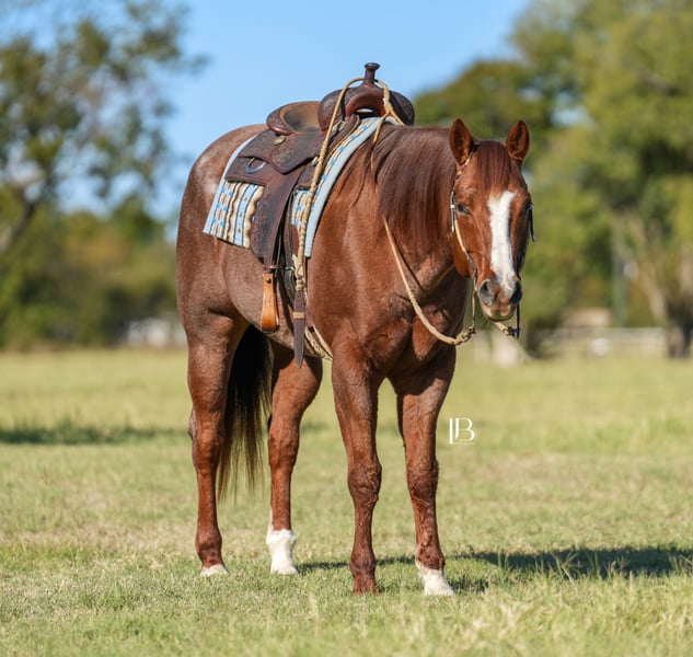 ⚜️ 𝓗𝓮𝓻𝓲𝓽𝓪𝓰𝓮 𝐖𝐢𝐧𝐭𝐞𝐫 𝓒𝓵𝓪𝓼𝓼𝓲𝓬⚜️ Happening now thru MONDAY | DECEMBER 29th - Available EXCLUSIVELY on HorseBid's website! For more details and to register visit: www.Horsebid.com CONSIGNOR CONTACT: LB Equine Sales, LLC 214-449-8028 LOCATION: Terrell, TX BREED: AQHA REGISTERED: Yes REGISTERED NAME: Redwinder COLOR: Red Roan HEIGHT: 16 AGE: 12 GENDER: Gelding Need a safe, reliable, teacher/packer type that’s YOUTH and OLD lady safe?! Big Red is the man! This gentle giant has many show miles under his belt. He went Circuit Champion in Youth Aged Geldings and Reserve Champion Open Aged Geldings at the 2021 AQHA World show with a youth rider! He has been shown at color breed congress and received 5th in All Breed Amateur W/T Ideal Ranch Riding with a youth. You will absolutely adore his kind big doe eyes, sweet loving temperament, and puppy-dog like personality. Easy – the same guy every time – with extensive miles under his belt. Get ready because Big Red will help you improve your confidence in the ring! Big Red strides out beautifully for the hunter under saddle! He goes around gorgeous across the ground with a lovely big stride that is eye catching. He would make a brilliant western dressage horse as well! He is soft in a snaffle and comes into a frame effortlessly. Side passes, knows his leads, pivots, and has a great whoa button/back up! Big Red does not require any lunging prior to riding and is the same ride whether you ride him once a month or once a week. Safe with no buck/bolt/rear. He ADORES toting around youth riders and is a straight forward kinda guy – never looking to cheat you. Suitable for any level rider, I would love to find him another youth kiddo or older person to tote around. He adjusts to his rider and knows his job when he needs to go in packer mode. He will pony other horses, and is never grumpy, he is always willing and ready for your next cue. He has an adorable friendly out-going personality, is easy to catch/tie, stands quiet as a mouse for mounting, respectful for vet/farrier etc. Crosses water, over bridges, and steps over poles out on the trail too!! With his show experience, his kind, and seasoned temperament we know he will make a great partner for any youth or adult looking for confidence in and outside the show pen! Sells with a vet report on file, 100% sound and goes BAREFOOT! Will x ray good/clean! recently dewormed, vaccinated, and teeth floated. Not currently on any maintenance as well. He is in his winter woolies, and wears a size 80 blanket when it drops below freezing. He can live a show horse lifestyle in a stall (neat in a stall) or be kicked out to the pasture with friends just fine. No known vices. Hops right in the trailer, trailers well, backs off like a gentleman. HYPP N/N per his papers. All bill of sale paperwork and AQHA papers in hand and will be signed/transferred at the conclusion of the sale. Looking for a kind and well-seasoned been there done that gelding to show in the all-around or play at home for pleasure? You’ve found your match! Shipping can be coordinated to any location.