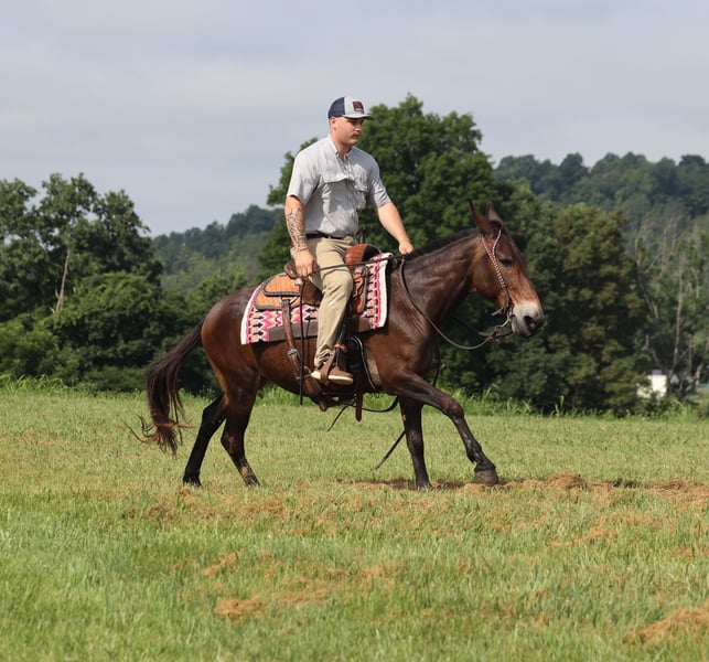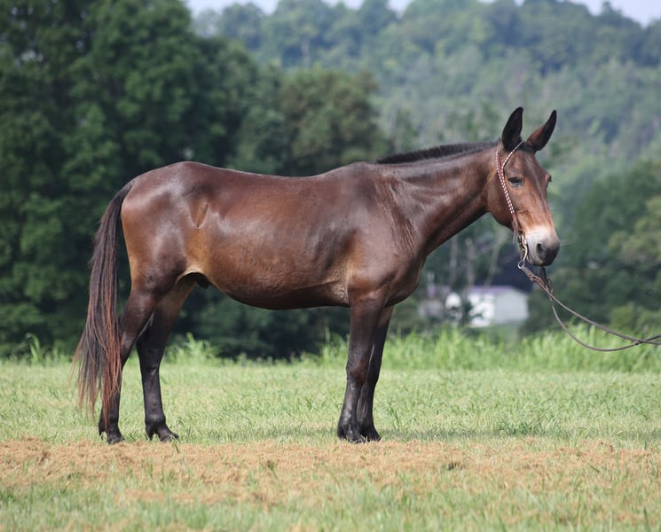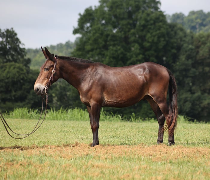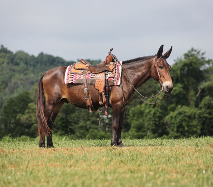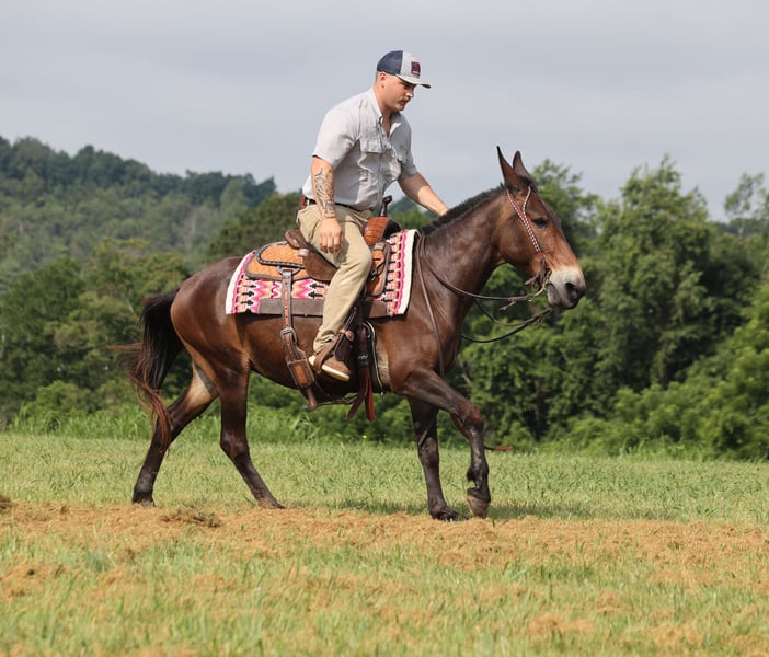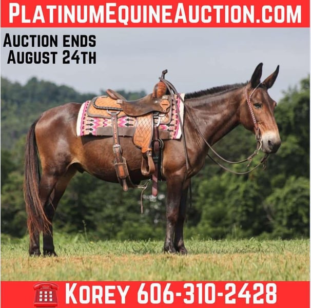 ONLINE AUCTION Place your bids at www.PlatinumEquineAuction.com Starting Bid $3500 Auction ends August 24th, 2025 Need a new saddle? Check out White Rock Saddles on our website or Facebook Gus is a beautiful bay John (gelding), he is a 13 yrs old and he stands a stocky built, 14.2 hands tall! This is one mule that is 100% no fuss-easy to ride! Whether you ride him every day or leave him off for a couple months, he tacks up quiet and rides off gentle. Our 7 year old son has ridden him around the farm and though the trails. Gus is very laid back, rides on a loose rein and is never in a hurry. Gus is not spooky and has miles and miles of experience from the mountains to the valleys he will cross anything that he is asked to from rivers to creeks, scale steep slopes while being sure footed and picks his path is a tight situation. He can handle the rough rocky trails, steep inclines and deep water… nothing bothers him and he feels right at home on the trails! He has been ridden around cattle and had a rope thrown off of him. Gus has been hauled on week long and weekend trail rides. He has been ridden by all members of our family. He loads right up, stands tied to the trailer or on a picketline either one. Gus will neck-rein around, stops easily and lopes very smooth. He picks up his leads and rides in the arena as well as outside. Dogs do not bother him and is traffic safe! Gus is farrier friendly and has no issues with his ears. Call Korey Patrick 606-310-2428 with any questions. Located in Whitley City, KY. ONLINE AUCTION Place your bids at www.PlatinumEquineAuction.com Starting Bid $3500 Auction ends August 24th, 2025 Need a new saddle? Check out White Rock Saddles on our website or Facebook