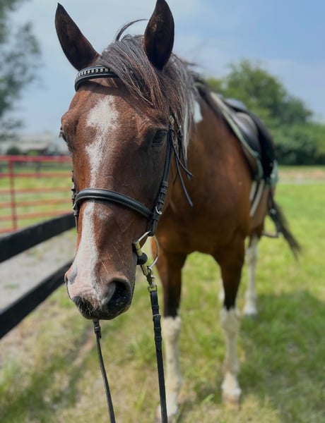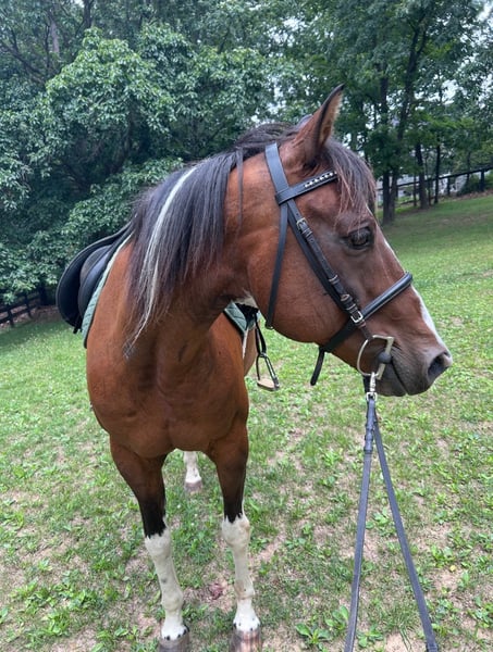 Jake, is a 17 year old 15.2 hand, tricolored paint, Rocky Mt. Spotted/ American Saddlebred/ Quarter horse cross. He is naturally gaited and a blast to ride. I am 68 and he was always very careful with me. He is highly responsive, very well trained with leg aids, gentle enough for a beginner but definitely loves someone that knows which buttons to push. He will take a bit but prefers a bitless bridle and even goes brideless if using leg aids. He came to us with shoes on but we have since transitioned him to barefoot. He is used to lighter riders, someone less than 150 lbs. And would do best not going over that.