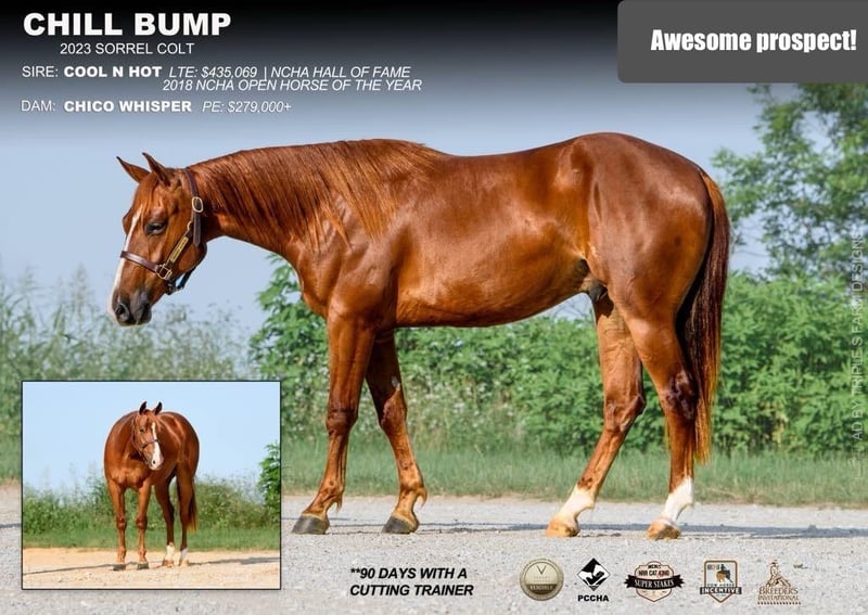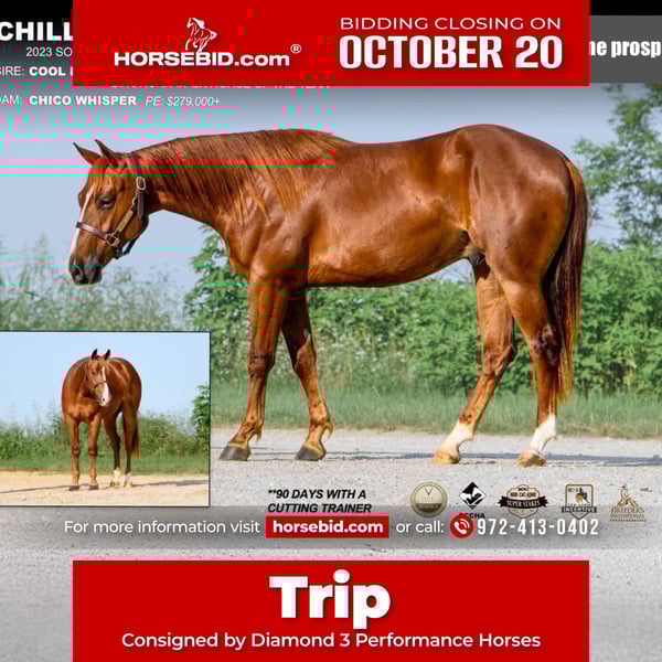 ♦️ 𝐭𝐡𝐞 𝐀𝐌𝐄𝐑𝐈𝐂𝐀𝐍 𝓕𝓪𝓵𝓵 𝓒𝓵𝓪𝓼𝓼𝓲𝓬 ♦️ Happening now thru MONDAY | OCTOBER 20th - Available EXCLUSIVELY on HorseBid's website! For more details and to register visit: www.Horsebid.com CONSIGNOR CONTACT: Diamond 3 Performance Horses 972-413-0402 LOCATION: Ravenna, TX BREED: AQHA REGISTERED: Yes REGISTERED NAME: Chill Bump COLOR: Sorrel HEIGHT: 14.3 AGE: 2 GENDER: Gelding Here is a nice 2 year old gelding by Cool N Hot that has earned $435,069 in the NCHA. He was the 2018 NCHA open horse of the year. His dam Chico Whisper has PE of $279,000+. This gelding has been with a cutting trainer for over 90 days. He can continue in cutting training as he is showing talent there. He would also make a nice cowhorse or rope horse. He has a good handle and he is really good minded. Trip doesn’t have any buck to him. He has been rode outside the arena also and has done really well. He is eligible for Valley Equine Super Stallion Incentive, Breeders Invitational, NCHA Super Stakes, PCCHA, NRCHA Cowhorse Incentives, and Gold Buckle Futurities.