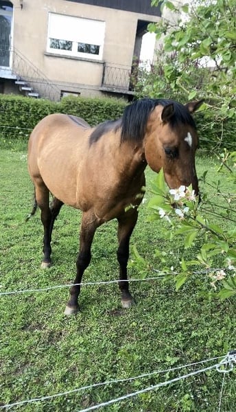 Hongre Quarter Horse de 2 ans, prometteur et bien dans sa tête. Cheval idéal pour le trail et les sorties en extérieur, il se montre très courageux, froid et sans peur face à son environnement (bruit, véhicules, animaux, obstacles naturels). Manipulé régulièrement, proche de l'homme, il apprend vite et montre un excellent mental pour son jeune âge. Convient parfaitement pour un cavalier souhaitant former un cheval polyvalent, sûr et agréable au quotidien. Panels 6 N/N 2 jähriger Quarter Horse Wallach, vielversprechend und ausgeglichen im Charakter. Ideal für Trailreiten und Ausritte im Gelände, absolut nervenstark, mutig und unerschrocken gegenüber seiner Umgebung (Lärm, Fahrzeuge, Tiere, natürliche Hindernisse). Regelmässig im Umgang, menschenbezogen, lernt schnell und zeigt für sein junges Alter ein hervorragendes Temperament. Perfekt für Reiter, die ein vielseitiges, zuverlässiges und angenehmes Pferd selbst ausbilden möchten. Weiter Informationen und Fotos auf Anfrage. 6 panels N/N