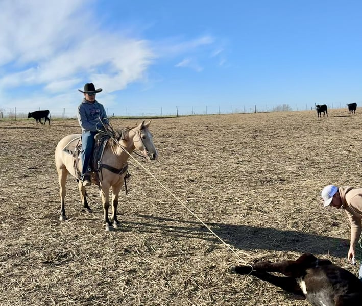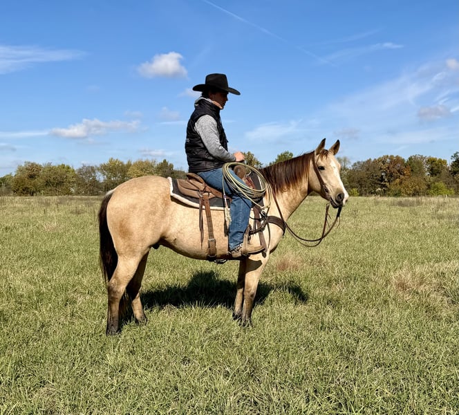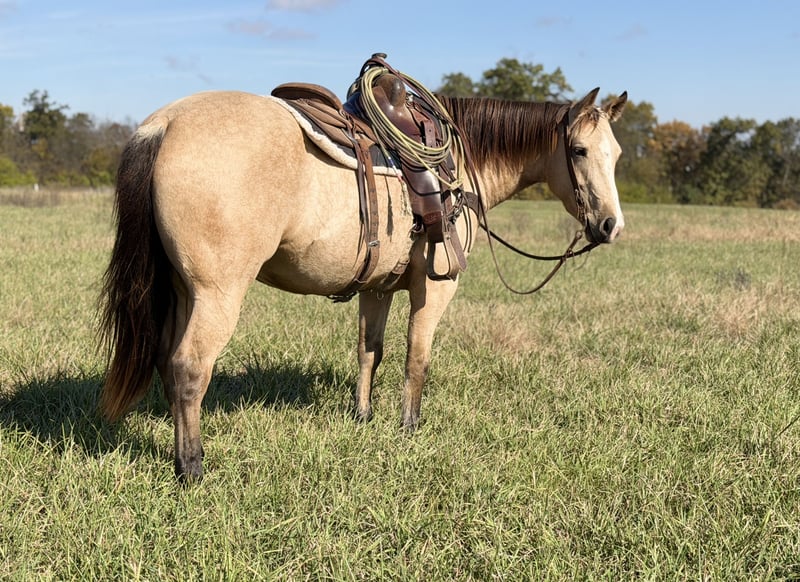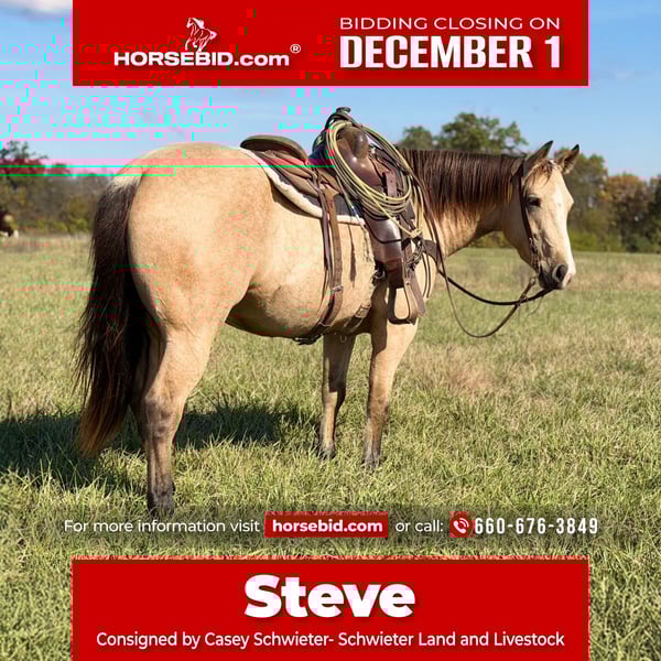⚜️ 𝓽𝓱𝓮 𝐇𝐨𝐫𝐬𝐞𝐦𝐚𝐧'𝐬 𝓢𝓱𝓸𝔀𝓬𝓪𝓼𝓮⚜️ Happening now thru MONDAY | DECEMBER 1st - Available EXCLUSIVELY on HorseBid's website! For more details and to register visit: www.Horsebid.com CONSIGNOR CONTACT: Casey Schwieter- Schwieter Land and Livestock 660-676-3849 LOCATION: Shelbina, MO BREED: AQHA REGISTERED: Yes REGISTERED NAME: Jeff My Tivio COLOR: Buckskin HEIGHT: 14.3 AGE: 4 GENDER: Gelding 2021 AQHA Buckskin Gelding- JEFF MY TIVIO “Steve” An eye-catching 4 year old AQHA registered buckskin gelding that can get a job done and will turn heads while he's doing it. Dependable, versatile, easy to get along with in any environment and just the right size at a thick, 14.3 hands. Steve has the experience and ability to go in any direction-an all around, nice gelding with good foundation bloodlines. Good footed and easy to handle- bathes, loads and hauls. He has a nice one-hand neck rein and catches his leads. He's also been exposed to tarps, flags and isn't afraid of a rope. With lots of exposure, being hauled locally for day work and catch jobs and even to the Nebraska Sandhills for a college ranching internship, Steve has seen the sights. From gathering, roping and dragging during branding season, to riding down the road or on the trails with dogs, wildlife and cattle coming from any direction, on all types of terrain, he remains calm and gets his job done. Speed him up or slow him down- Go rope a bull and then go trail ride. We purchased Steve straight off the farm from the local breeder; He is an honest horse with a bright future ahead. Steve has the looks, ability, personality and is full of potential to become your next forever horse.