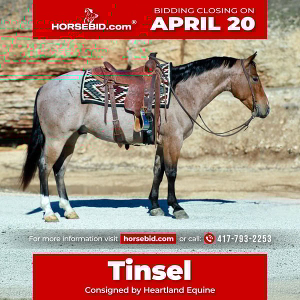⚜️𝐭𝐡𝐞 𝓔𝓵𝓲𝓽𝓮 𝐒𝐩𝐫𝐢𝐧𝐠 𝐂𝐥𝐚𝐬𝐬𝐢𝐜⚜️ Happening now thru MONDAY | APRIL 20th - Available EXCLUSIVELY on HorseBid's website! For more details and to register visit: www.Horsebid.com CONSIGNOR CONTACT: Heartland Equine 417-793-2253 LOCATION: Mt Vernon, MO BREED: Quarter horse REGISTERED: Yes REGISTERED NAME: Cowboys Tin Star COLOR: Red roan HEIGHT: 14.3 AGE: 4 GENDER: Gelding Cowboys Tin Star aka “Tinsel” is a 4 year old bay roan AQHA gelding standing 14.3 hands. He is absolutely stunning and built like a tank, Tinsel is as shapey as they come. This horse has gone through our program, he has passed every test we have thrown at him and checked all the boxes. Tinsel is uncomplicated to ride making him suitable for any level rider. He is a point & go type of gelding. Plenty of buttons, soft in the face, nice stop and picks up his leads- he is smooth & fun to ride. Moves off leg pressure, stays light in your hands and rides correct. NOTHING phases this young gelding: flappy tarps, water, trail obstacles, traffic, etc. He is prepared to handle anything & everything you could possibly throw at him! He has been used outside and at the feedlot. We have used him to load trucks, sort and doctor cattle. He has been exposed to A LOT! Tinsel is ready to go on with the career of your choosing, the options are endless for a BIG gentle & broke gelding like him! We are very proud to represent a horse of this caliber and can’t wait to see what he accomplishes with his new owners. No buck or bad habits. He is an absolute gentleman, stands to be saddled/mounted. Tinsel is easy to be around, he is a favorite in our barn. You will love his calm, sweet demeanor as much as we do. He loves attention and to be groomed. Very easy to catch. Great for the farrier. Tinsel is sound, sane & ready to move into your barn!