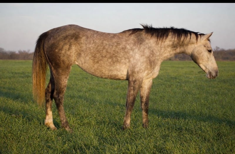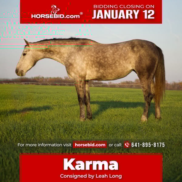 ♦️𝐍𝐄𝐖 𝐘𝐄𝐀𝐑'𝐒 𝑬𝒙𝒕𝒓𝒂𝒗𝒂𝒈𝒂𝒏𝒛𝒂♦️ Happening now thru MONDAY | JANUARY 12th - Available EXCLUSIVELY on HorseBid's website! For more details and to register visit: www.Horsebid.com CONSIGNOR CONTACT: Leah Long 641-895-8175 LOCATION: Sulphur Springs, TX BREED: Quarter horse REGISTERED: Yes REGISTERED NAME: “Queens Tari Gold” COLOR: Grey HEIGHT: 15.1 AGE: 4 GENDER: Mare 🩶 Meet Karma – The Grey Mare That Already Has Her Life Together 🩶 Karma is a 4-year-old grey mare, standing 15.1 hands, and she’s easy on the eyes with a brain to match. Somehow, she missed the memo about being young and silly and instead decided to be honest, gentle, and useful. She’s easy to catch, loves attention, and genuinely enjoys being someone’s horse. She leads, loads, ties, bathes, and stands great for the farrier—basically all the things we wish every horse came pre-installed knowing. Grab her and go, because she’s ready for whatever job you throw her way without an argument. Karma has seen plenty of ranch work and knows exactly what she’s doing. She tracks cattle well, has been roped on in the pasture many times, and holds the rope tight without quitting on you. She’s also worked the sale barns, opens and shuts gates like a seasoned pro, and has been ridden next to busy highways without batting an eye. Loud, busy, and chaotic don’t bother her—she’s got places to be. When it’s time to relax, Karma shines as a trail horse deluxe. Deep water, big logs, steep ditches—point her at it and she’ll go. She takes care of her rider every step of the way and makes long rides feel easy and enjoyable. She’s super soft in the bridle, has lots of buttons, is 100% sound and sane, and ready to step into a new home where she can keep being someone’s dependable, do-it-all partner. If you’re looking for a young mare with experience, brains, and a heart of gold—this is your sign. Karma’s already earned her good name.
