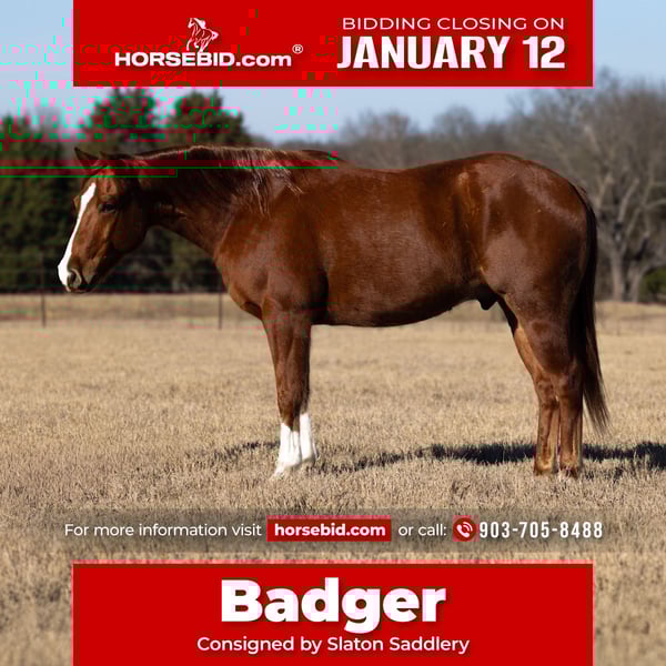 ♦️𝐍𝐄𝐖 𝐘𝐄𝐀𝐑'𝐒 𝑬𝒙𝒕𝒓𝒂𝒗𝒂𝒈𝒂𝒏𝒛𝒂♦️ Happening now thru MONDAY | JANUARY 12th - Available EXCLUSIVELY on HorseBid's website! For more details and to register visit: www.Horsebid.com CONSIGNOR CONTACT: Slaton Saddlery 903-705-8488 LOCATION: Canton Texas BREED: Quarter Horse REGISTERED: Yes REGISTERED NAME: “JACKS HONEY BAR JF” COLOR: Sorrel HEIGHT: 15 AGE: 5 GENDER: Gelding “JACKS HONEY BAR JF” 2020 AQHA Sorrel Gelding – Gentle, Safe, and Ranch Ready Badger is as kind and honest as they come. He does not a mean bone in his body and is gentle enough for just about anyone. He hasn’t had a full-time job — he’s simply been the kind of horse you can saddle up, step on, and go ride. Whether it’s riding out or checking cattle, he takes care of his rider every time. Badger is not spooky, doesn’t look for trouble, and stays calm in new situations. Just point him in a direction and he’ll go. He weighs approximately 1,250 pounds, stands 15 hands, stays sound, and is clean with no scars, bumps, or issues. He has a calm, kind eye and genuinely enjoys being around people. Born and raised on the same place, this gelding has had consistent handling and a solid foundation. He’s the kind that’s hard to find — safe, gentle, and dependable. A great fit for someone looking for a trustworthy ranch, trail, or family horse.