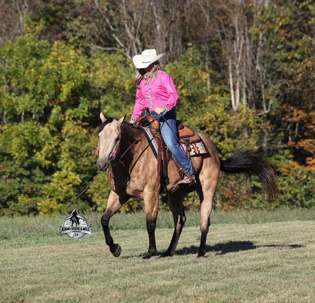 He is consigned to the COWGIRL CADILLACS Sale in Wickenburg, AZ on February 20-21st. You can bid online or bid in person. There is a preview day before the sale or you can come ride him prior to the sale in Mt. Vernon, KY. Register to bid at www.CowgirlCadillacs.com More info at www.AdamsHorseAndMuleCo.com $10000 starting bid Smooth As Pendleton…a little bit of whiskey is said you calm your nerves and ease the tension, just making you more relaxed… there is not a more fitting name for this guy than Whiskey!!! As a 15.2h, 2021 Model with 11 AQHA points to his resume and over $6800 earnings, Whiskey is no stranger to the spotlight as he has been shown extensively and qualified in 2024 for the AQHA World Show in Ranch Trail (which is a ranch and trail obstacle course that involves cattle and log jumps). He rides low headed on a draped rein, lopes perfect circles, takes his leads, does flying lead changes, spins both ways, side passes, and has a good stop. To say the least he has all the moves and maneuvers that a person could dream of. Just as the pressure of the show pen doesn’t bother Whiskey neither does a roaring rodeo crowd of 3000 people, screaming and cheering as the speakers blare Kid Rock’s song “Born Free”, as he lopes around the arena carrying the flag at the grand entry. While at the rodeo Whiskey has been used to sort, pen and load rodeo bulls. The girls also used Whiskey to give “pony rides” on at 4 different rodeos. They had all ages of kids and adults stand in line for a ride on their horses. Obviously, Whiskey knows his way around the show pen and rodeo arena, but this pretty boy loves to get dirty out on the trails, packing the kids through the mud! Whiskey will build your confidence levels out on the trails and make a nervous beginner look like a seasoned pro! He has been trail ridden extensively in multiple states including, Iowa, Minnesota, South Dakota, Kentucky, Tennessee and North Carolina. Steep slopes, deep water, deadfall, boggy mud, all sorts of wildlife… nothing phases him, he is not spooky and he is a master on the trails! Whiskey will take care of his rider in any situation or terrain. Whiskey has been ridden around the ranch, he knows his way around cattle and has been roped off as well. He will hold what you tie to him and doesn’t get nerved up in a bad situation. Whiskey is not spooky and is accustomed to tarps, wind dancers, bull whips and gun fire. Whiskey has been ridden in English tack and will jump across the rails with ease. We have had him through town, the drive thru and he is traffic safe. Whiskey loves to take a bath, get soaped up, get his hair done up in braids and loves to spend time with the kids. If you are looking for a horse to show, a horse to trail ride, a horse to do ranch work on, a horse to jump and a horse to do lessons with… instead of buying six horses just buy the all in one and it will be smooth sailing the rest of the way because nothing is as Smooth As Pendleton!!! Whiskey is available to ride and see in Mt. Vernon, KY until the week of the sale Feb. 16-21. Call for more info or if you have any questions 606-308-2461. He is consigned to the COWGIRL CADILLACS Sale in Wickenburg, AZ on February 20-21st. You can bid online or bid in person. There is a preview day before the sale or you can come ride him prior to the sale in Mt. Vernon, KY. Go to visit our website for more pics and a video www.AdamsHorseAndMuleCo.com AHAMC has been in the horse business and sold horses over the internet since 2005. We have a long track record of success with hundreds of happy customers. We work hard to match riders with the correct horses and specialize in beginner safe, family friendly horses that have been used and checked out by our family! We can set up transportation anywhere in the US and look forward to working with you. Register to bid at www.CowgirlCadillacs.com More info at www.AdamsHorseAndMuleCo.com $10000 starting bid