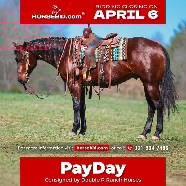 🌟𝑨𝒑𝒓𝒊𝒍 𝐀𝐋𝐋 𝐒𝐓𝐀𝐑 𝐋𝐈𝐍𝐄𝐔𝐏🌟 Happening now thru MONDAY | APRIL 6th - Available EXCLUSIVELY on HorseBid's website! For more details and to register visit: www.Horsebid.com CONSIGNOR CONTACT: Double R Ranch Horses 931-994-7486 LOCATION: Lyles, TN BREED: AQHA REGISTERED: Yes REGISTERED NAME: Gallo Lil Cockamamie COLOR: Bay HEIGHT: 15.2 AGE: 5 GENDER: Gelding Safe. Solid. Absolutely SPECIAL. Meet PayDay. This jaw dropping, blood bay 5 year old AQHA gelding is the complete package. Standing 15.2hh, He’s one of the fanciest geldings you’ll lay your eyes on, with a presence that turns heads everywhere he goes… but what makes him truly exceptional is everything underneath the surface. PayDay has been with us for the last three years. We started him here at our place, and he has been brought along the right way every step of the way. He’s honest, willing, and has proven himself time and time again to have the kind of brain (and build) everyone is searching for. The only reason he is being offered is simply due to his height. He matured taller than we anticipated and outside of my personal preference… otherwise, he wouldn’t be going anywhere. He is by a son of Two Eyed Red Buck and out of a daughter of Gallo Del Cielo (Rooster), giving him a pedigree packed full of proven champions and performance bloodlines. This is the kind of breeding that speaks for itself… and he lives up to every bit of it. PayDay is the first to meet you at the gate, always gentle, kind, and easy to be around. He has that “in your pocket” personality everyone loves, paired with a soft, kind eye and a quiet and sweet nature. He has loads of personality, can be quite the ham at times- and he always keeps us laughing. He will come find you out in the big pasture, in case you might have some attention to give him! He has good ground manners, He stands quietly for grooming, saddling, bathing, the farrier, and the vet. Loves a bath! (He’s kind of a diva.) Under saddle, he is a beautiful mover- soft, and responsive. He rides with a nice handle, moves off your leg, and just naturally carries himself well. Slow spins, big stop and an easy lope. He has been trail ridden extensively. he is sure-footed, level-headed, and confident. Water, hills, wildlife, or new places don’t phase him. You can relax and enjoy the ride. He’s been hauled and exposed to all kinds of settings and scenarios, including downtown in the city traffic, indoor arenas, and out in the country. PayDay has also done some ranch work, including gathering, checking fences and a little pasture roping. He’s been started on the head side as well, and has the ability and mind to go any direction you choose. I also think he would excel in ranch horse classes! He’s versatile, we’ve thrown a lot at him. He’s even been ridden english, really just to see how he would do- and he felt so classy and natural! Popped over some jumps, no problem. He’s so much fun. One of the best things about PayDay, is how he’s up for whatever you want to do, he’s responsive and will move out easily, but he is also slow and chilled out at the same thing. It’s rare to find both types in one horse. His entire life ahead of him- he’s going to make someone everything they’ve ever dreamed of. To put it simply… he’s one of ours. And that says everything. Sound, sane, and ready to take on the world. Or just be your best friend. Recent PPE completed at Todd County Animal clinic- Equine Vet- passed with flying colors! Contact Isaac Vick 931-994-7486 to learn more or schedule a visit to meet PayDay in person.