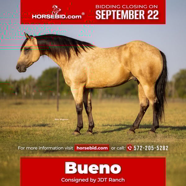 🍁𝒕𝒉𝒆 𝐅𝐀𝐋𝐋 𝑺𝒑𝒆𝒄𝒕𝒂𝒄𝒖𝒍𝒂𝒓🍁 Happening now thru MONDAY | SEPTEMBER 22nd - Available EXCLUSIVELY on HorseBid's website! For more details and to register visit: www.Horsebid.com CONSIGNOR CONTACT: Jdt Ranch 572-205-5282 LOCATION: Crescent, OK BREED: Aqha REGISTERED: Yes REGISTERED NAME: Buenos Dakota Jody COLOR: Buckskin HEIGHT: 15.3 AGE: 4 GENDER: Gelding What a gorgeous 4yr old we are proud to offer to the public! Meet bueno a 15.3 hand 1250lb stunning buckskin gelding! We are so pleased with this guy! He is an everyday employee here at the ranch and he had become a go to! He is true everyday full of try and an impeccable work ethic to him. He is soft and correct and respectful in every way and knows a true days work. He also has some of the prettiest movement I’ve seen in a long long time Hits the ground soft you never move in the saddle he would make an outstanding ranch trail or ranch class gelding . He has doctored pasture cattle pushed and shipped and checks pairs everyday . He has seen mile upon mile and is confident in himself. He is not a spooky or reactive horse very quiet . He is ready for his person and his career Go show him and win Go ranch on him Go trail ride! Anything your needing an equine partner for he is ready to step into those shoes He has a lifetime ahead of him Current x rays and is sound in every way! Please feel free to call or we can FaceTime so you can meet Bueno for yourself! Watch his video and enjoy! Megan 572-205-5282