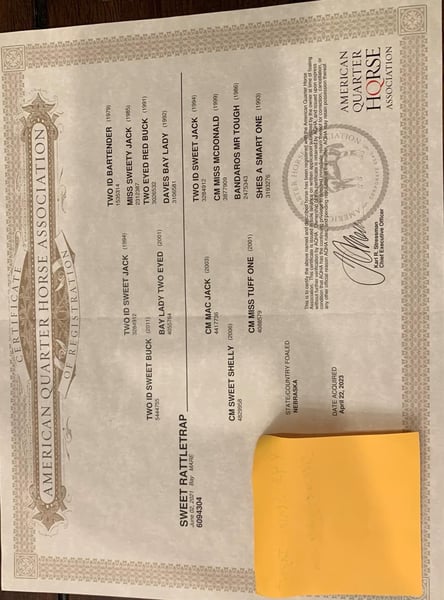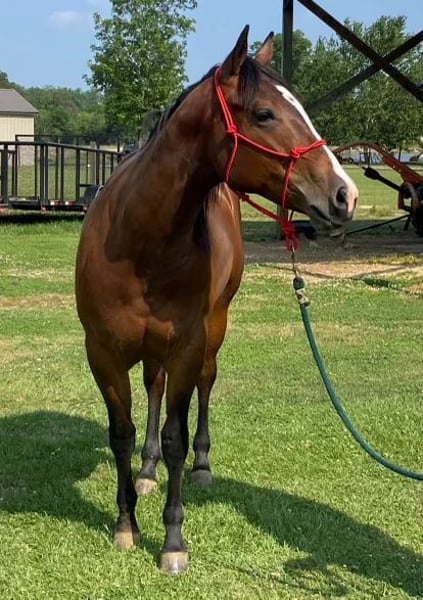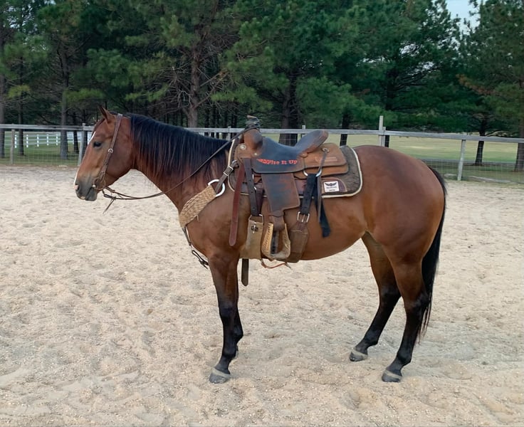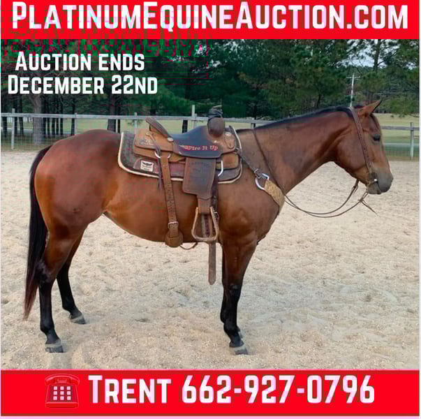 ONLINE AUCTION Place your bids at www.PlatinumEquineAuction.com Starting Bid $3500 Auction ends December 22nd, 2024 Need a new saddle? Check out White Rock Saddles on our website or Facebook! Sweet Rattletrap (Nemo) is a coming 4 yr old mare that stands 14.3 and is an OWN Daughter to Reserve World Champion Two ID Sweet Buck. Hands down you won’t find a prettier filly who has that dark bay color throughout the winter months. She gets looks and compliments everywhere we go! Nemo stands tied, stands to saddle, loads, bathes, can clip with ease, and stands for farrier. Nemo’s pedigree has Pitzer Ranch breeding and is Pitzer Invitational Eligible! She has been exposed to cattle, hauled to ride in arenas as well as outdoors. She has been ridden in pastures and trails including up and down hills. She has been exposed to 4 wheelers, mowers, tractor, cattle, and the roping sled. Nemo is friendly and will come to you when you open the gate or stall door. Her sire (Two ID Sweet Buck) has 68.5 AQHA Points, AQHA Reserve Versatility Ranch Horse Cowboy World Champion, AQHA World Show Qualifier in Jr. heeling and ranch riding. Nemo is a pleasure to be around and is ready to take you in any direction. For more info contact Trent Barnett 662-927-0796 Located in Calhoun City, MS. ONLINE AUCTION Place your bids at www.PlatinumEquineAuction.com Starting Bid $3500 Auction ends December 22nd, 2024 Need a new saddle? Check out White Rock Saddles on our website or Facebook!
