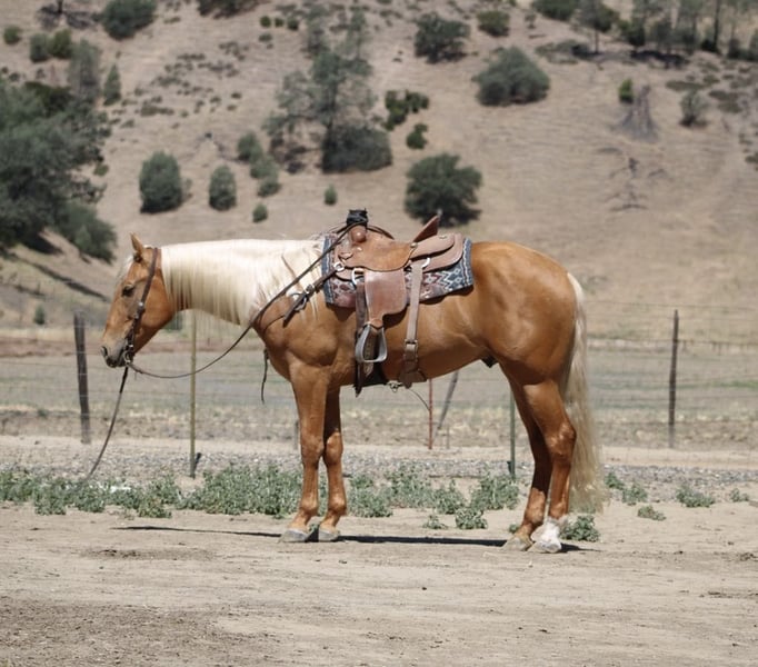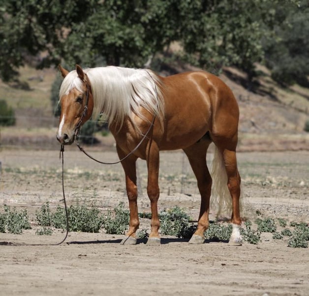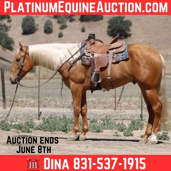 ONLINE AUCTION Place your bids at www.PlatinumEquineAuction.com Starting Bid $3500 Auction ends June 8th, 2025 Need a new saddle? Check out White Rock Saddles on our website or Facebook! Meet 24-Carrot This golden palomino is a real head-turner, capturing everyone’s attention with his radiant beauty. Picture this: a magnificent horse with a long, flowing mane and tail that shimmer in the sunlight. Standing at 16 hands tall, he’s like a living, breathing work of art. And despite being just 5 years old, he carries himself with the calm and gentle spirit you’d expect from a much older horse. He’s got this adorable puppy-dog personality that just melts your heart. I swear, if he could, he’d be right there snuggling with you on the couch! Riding 24-Carrot is an absolute dream. He transitions between walk, trot, and canter so smoothly and gracefully. He’s got a lovely headset, responds beautifully to leg cues, and stops and backs with ease. You can tell he’s been trained for a variety of disciplines. But don’t let his good looks fool you – he’s incredibly versatile too! Whether he’s navigating tough trails or tackling obstacle courses, he approaches everything with the confidence of a seasoned pro. What really gets me about 24-Carrot are his kind, intelligent eyes. They say a lot about his personality. He stays calm even around busy roads, making him super safe for riders of all levels. He’s experienced on trails, confidently handles water, logs, trees, and wildlife. He doesn’t mind riding alone or with other horses. He’s been used to gather cattle and remains composed in any situation. Plus, he’s a champ on obstacle courses, unfazed by bridges, flags, bouncy balls, and tarps. This great boy is always happy to see you, stands patiently for everything from saddling to bath time, and travels well. If you’re interested in meeting 24-Carrot, reach out to Dina at Longhorn Ranch at 831-537-1915. located in Paicines, CA, and can arrange shipping throughout the US. ONLINE AUCTION Place your bids at www.PlatinumEquineAuction.com Starting Bid $3500 Auction ends June 8th, 2025 Need a new saddle? Check out White Rock Saddles on our website or Facebook!