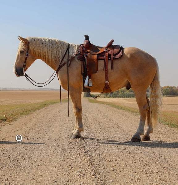 ONLINE AUCTION Place your bids at www.PlatinumEquineAuction.com Starting Bid $3500 Auction ends December 29th, 2024 Need a new saddle? Check out White Rock Saddles on our website or Facebook! Bar M’S Dallas is a gorgeous 2020 Palomino draft/ quarter horse cross gelding. He stands 16.1 hands tall. He is broke to ride the very best.He will take either lead and lope out of his tracks. He will stop and turn around like a 14.1 quarter horse. He had been ridden a lot in the arena and has hundreds of miles of trails under him. He has been used to direct traffic at large events. He will side pass to the mounting block. Dallas will lay down on command as well as sit up like a dog. He loads and hauls like a seasoned horse. Dallas will be the same horse every time he is saddled whether that’s every day or once a month. He stands for the farrier. Dallas loves his bath time as well. He has a huge heart and will work all day for whatever you ask of him. Dallas is sure to stand out with that beautiful Palomino color!! This big pretty gelding is suitable for just about any level of rider, making him a perfect fit for the entire family. Dallas is current on all his vaccinations. Please call Bar M Horse Ranch Tom with any questions at 507-360-6178 Located in Windom, MN. ONLINE AUCTION Place your bids at www.PlatinumEquineAuction.com Starting Bid $3500 Auction ends December 29th, 2024 Need a new saddle? Check out White Rock Saddles on our website or Facebook!