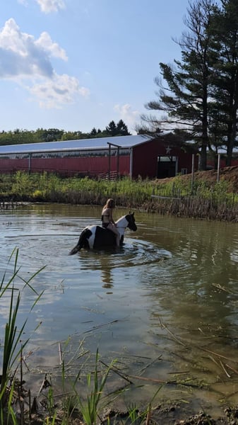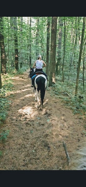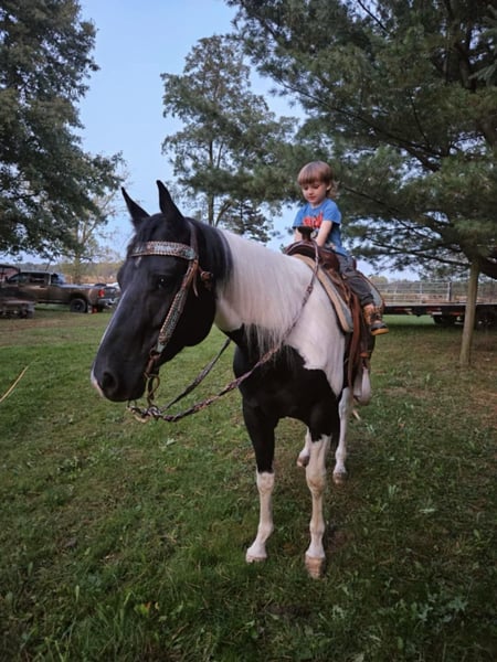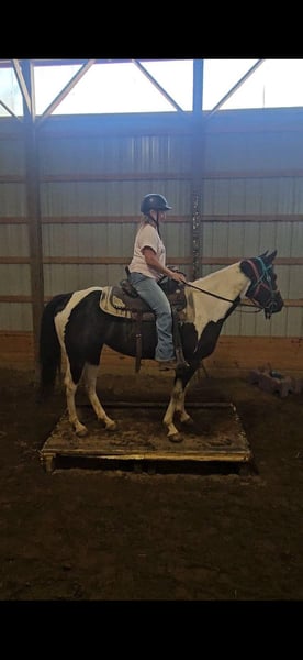 ONLINE AUCTION Place your bids at www.PlatinumEquineAuction.com Starting Bid $3500 Auction ends October 20th, 2024 Need a new saddle? Check out White Rock Saddles on our website or Facebook! Breezin Tazzy Cat aka Sweet Pea is a 4 year old registered American Paint Horse with the kind of markings that never fail to turn heads anywhere that she goes. Taris Breezin Cat quickly earned her barn name (Sweet Pea) as she is truly one of the kindest, gentlest, and most willing mares that you will ever meet in your life, we can guarantee you that! Taris Breezin Cat aka Sweet Pea stands 14.2 hands high. Her sire is accomplished stallion Meradas Cat Alena and her grand sire is the one and only Cats Merada who boasts an overall LTE of 5 MILLION dollars! Sweet Peas dam is a 1D barrel horse that won her 2 year old futurity.(her dam was foaled in 1997) Mr. Star Breeze (her dams sire) has sired many horses that have been succesful in roping events, barrels, as well as poles. Sweet Peas has always been brought along in her riding journey slowly and correctly and we absolutely welcome a PPE at buyers expense. We also are more than happy to allow any serious buyers the opportunity to ride her themselves to see just how fabulous this mare truly is for yourself. She has been ridden extensively and will go in English tack, Western tack, or even bareback. Sweet Pea ois one of the smoothest moving mares that you will ever have the pleasure of swinging a leg over. This mare has been started slowly and correctly and has always been sound and will hold up a LOT LONGER AND BETTER than the horses that were pushed really hard as a 2 or 3 yo. She may only be 5 years old but this mare is one of a kind and always keeps her cool whenever she has been presented with anything new. She has been used in our lesson program and has shown her ability to adapt to just about and level or age of rider. This mare is the kind of horse to stop her all youve got to do is say the word whoah and sit in your seat and she will tuck her butt and come to a sliding stop. She also been ridden on the road as well as crosses bridges, obstacles, and tarps etc. Sweet pea is also trick trained and her tricks she can perform are laying down for mounting, bowing, as well as sitting down. She has participate in a 4 day 3 night trail ride where she put in 35 miles on the trails with varying levels of riders throughout the trip. She even rode from Pleasant Hill Lake Park all the way to Mount Geez and had to cross roads, rivers, and fallen limbs etc in order to make the ride. She is truly the definition of a push button style horse that goes in whatever direction you ask at whatever speed that you ask for. She also has very good verbal cues on the ground as well as under saddle. Our three year old son actually often gets her out of her stall and can lead her without issue. Sweet Pea has also been swam bareback through our pond and even into the deep end where she cannot touch. I was even amazed at just how quickly she was able to pickup riding completely bridleless through our obstacle course without any worry or concern. I also have to say that she has fantastic ground manners and also is started on some liberty work as well. She also has been over smaller jumps in English tack a handful of times and also has worked cattle a couple times as well. We have lots going on at our facility like tractors , cats, kids, dogs, side by sides, and even a back hoe and shes never been bothered by any of it. She has always had such a softness and quietness about her demeanor she truly is an old soul with the mind of a horse easily twice her age. We definately will miss having her with us because she often my go to for a variety of different jobs and activities and due to her safe nature and willing to please mindset. Sweet Pea is also fantatic about loading into a trailer, hauling new places, for the ferrer/vet, worming, as well as cross tying or standing on a highline overnight. She is on the middle of the totem pole when turned out with other horses and get along with every horse that we hvae introduced her to. Sweet Pea is extremely versatile and could go any direction such as staying a lesson horse, trick riding, Liberty work, Roping, Trail, Contesting, cutting and Penning, or even a super cute Hunter/Jumper. Sweet Pea has a current Coggins/Health certificate and we can help get you setup with a couple reputable haulers that are reasonably priced. We have a signed transfer through American Paint Horse Association so that buyer can get her transferred into their name as well. If you have any questions about Breezin Tazzy Cat aka Sweet Pea or would like to schedule a day to come meet and ride her at our facility in Ashland Ohio. Call or text Jonas Miller 419-512-7885. ONLINE AUCTION Place your bids at www.PlatinumEquineAuction.com Starting Bid $3500 Auction ends October 20th, 2024 Need a new saddle? Check out White Rock Saddles on our website or Facebook!