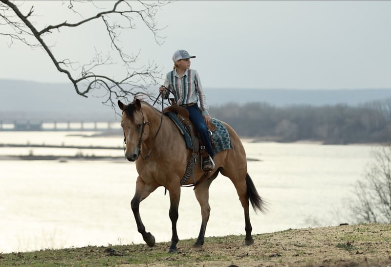 In the barn, he is just as pleasant to be around as he is under saddle. He is easy to catch, stands quietly for grooming, saddling, and mounting, and is well-mannered for the farrier. He loads, hauls, and ties with no issues and is an easy-keeping gelding. With his quiet nature, gentle disposition, and beautiful buckskin color, he would make an excellent family horse or a trustworthy trail partner for riders of any age.