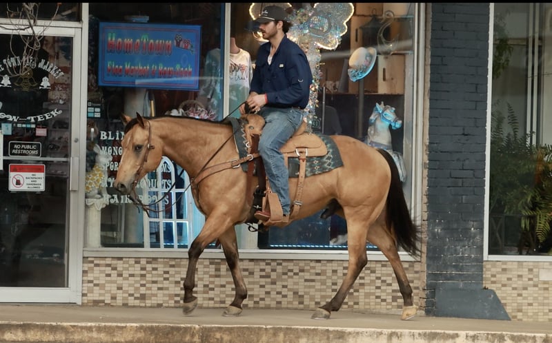 This 7-year-old buckskin gelding ("Five Ocloc Somewhere" aka Tombstone) is a quiet, gentle, and dependable horse that’s well-suited for trail riding and everyday use. He has a kind, easygoing demeanor and is safe and enjoyable for riders of any age. On the trail, he is calm and confident, handling rough terrain, hills, water crossings, wildlife, and traffic without hesitation. He rides out alone or in a group, keeps a steady, relaxed pace, and offers smooth, comfortable gaits that make every ride enjoyable.