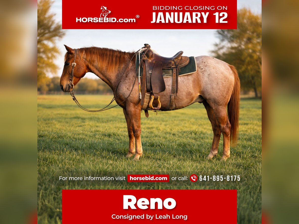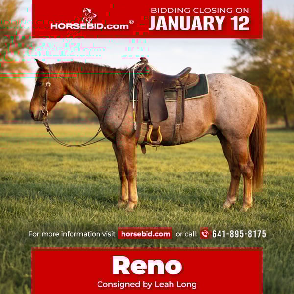 ♦️𝐍𝐄𝐖 𝐘𝐄𝐀𝐑'𝐒 𝑬𝒙𝒕𝒓𝒂𝒗𝒂𝒈𝒂𝒏𝒛𝒂♦️ Happening now thru MONDAY | JANUARY 12th - Available EXCLUSIVELY on HorseBid's website! For more details and to register visit: www.Horsebid.com CONSIGNOR CONTACT: Leah Long 641-895-8175 LOCATION: Sulphur Springs, TX BREED: QUARTER HORSE REGISTERED: No REGISTERED NAME: Reno COLOR: Red roan HEIGHT: 15 AGE: 7 GENDER: Gelding Meet Reno a 7-year-old grade red roan gelding standing 15 hands tall and built like a brick house with legs. He’s the kind of horse that makes you feel under horsed in everything else you own. Friendly, easy to catch, and convinced he deserves attention at all times, Reno leads, loads, ties, bathes, and stands like a gentleman for the farrier. If you’re wondering what you’re doing today… just grab Reno. He’s already ready. Reno is a legit ranch horse with more miles than most pickup trucks. No job is too big or too small he’ll hold absolutely anything on the end of a rope (yes, even buffalo 🦬), and he does it without getting you in a bind. He was started as a cutter and will still get down and drag his butt if you ask. He’s worked salebarns daily, opens and shuts gates like it’s his side hustle, and genuinely loves having a job. When the work is done, Reno switches gears into trail horse deluxe. Deep water, big logs, steep ditches that make you rethink your life choices—he crosses them all while taking care of his rider the entire way. He’s been on overnight camping trips, hauled all over, stalls great, or will stand tied at the hitching rail all day like he’s got nowhere else to be. Reno is super broke, soft in the bridle, and has been used his entire life. He can go right back to work or hit the trails,it honestly doesn’t matter to him as long as he gets to go along. A 12-year old boy rides him almost daily and ropes on him, and Reno takes care of him like it’s his job. We’d say he’s best suited for an intermediate rider who knows how to ride a broke horse. He is 110% sound, sane, and ready to find a new family. Reno isn’t just a horse,he’s the kind that makes long days shorter, hard jobs easier, and trail rides better. If you’re looking for one you can trust, laugh with, and count on… Reno might just be your guy. 🐴❤️